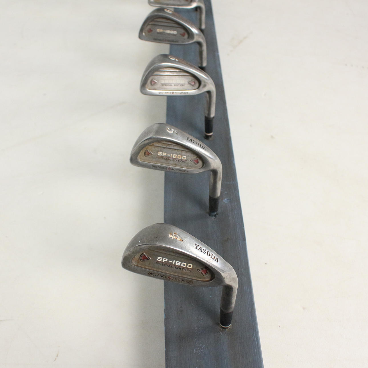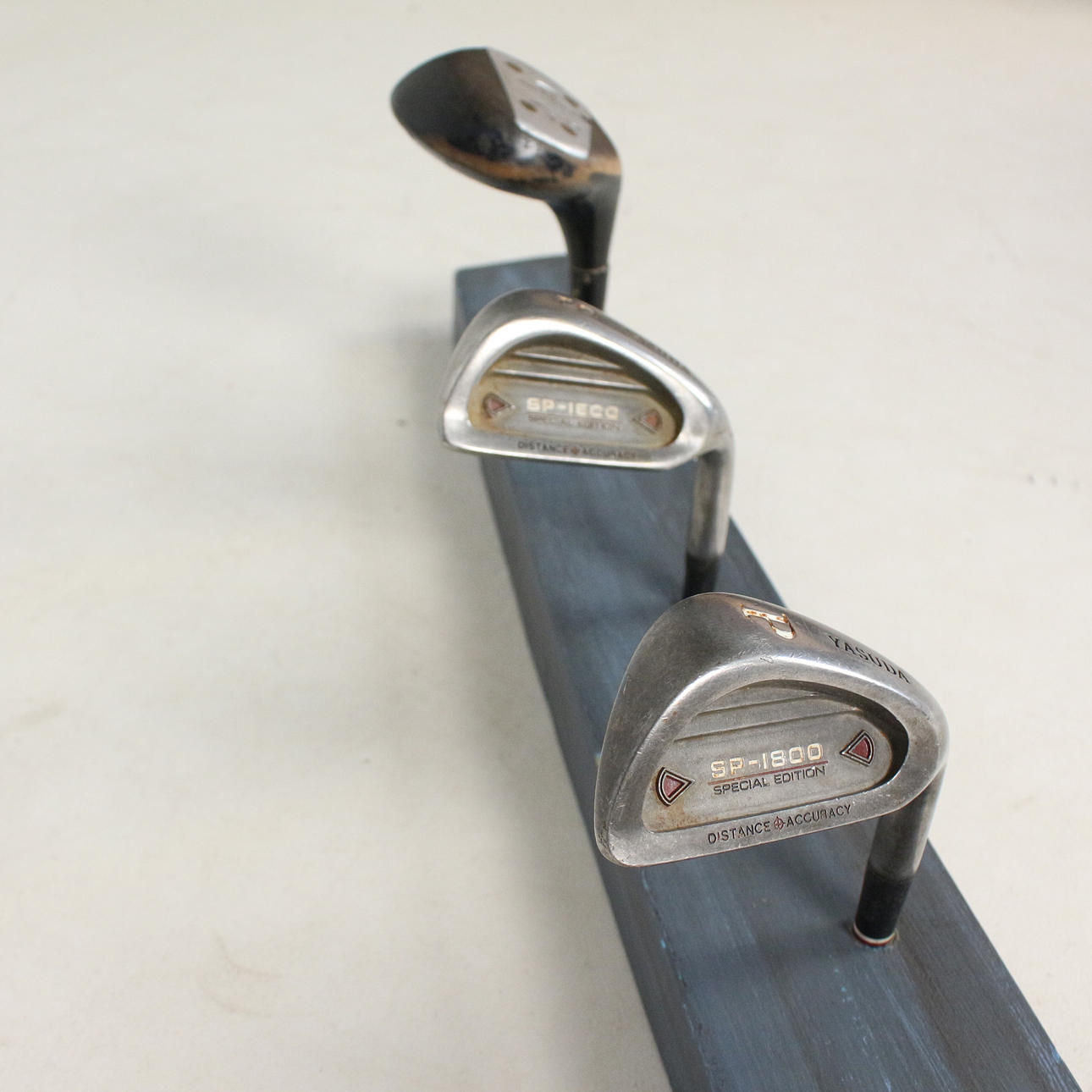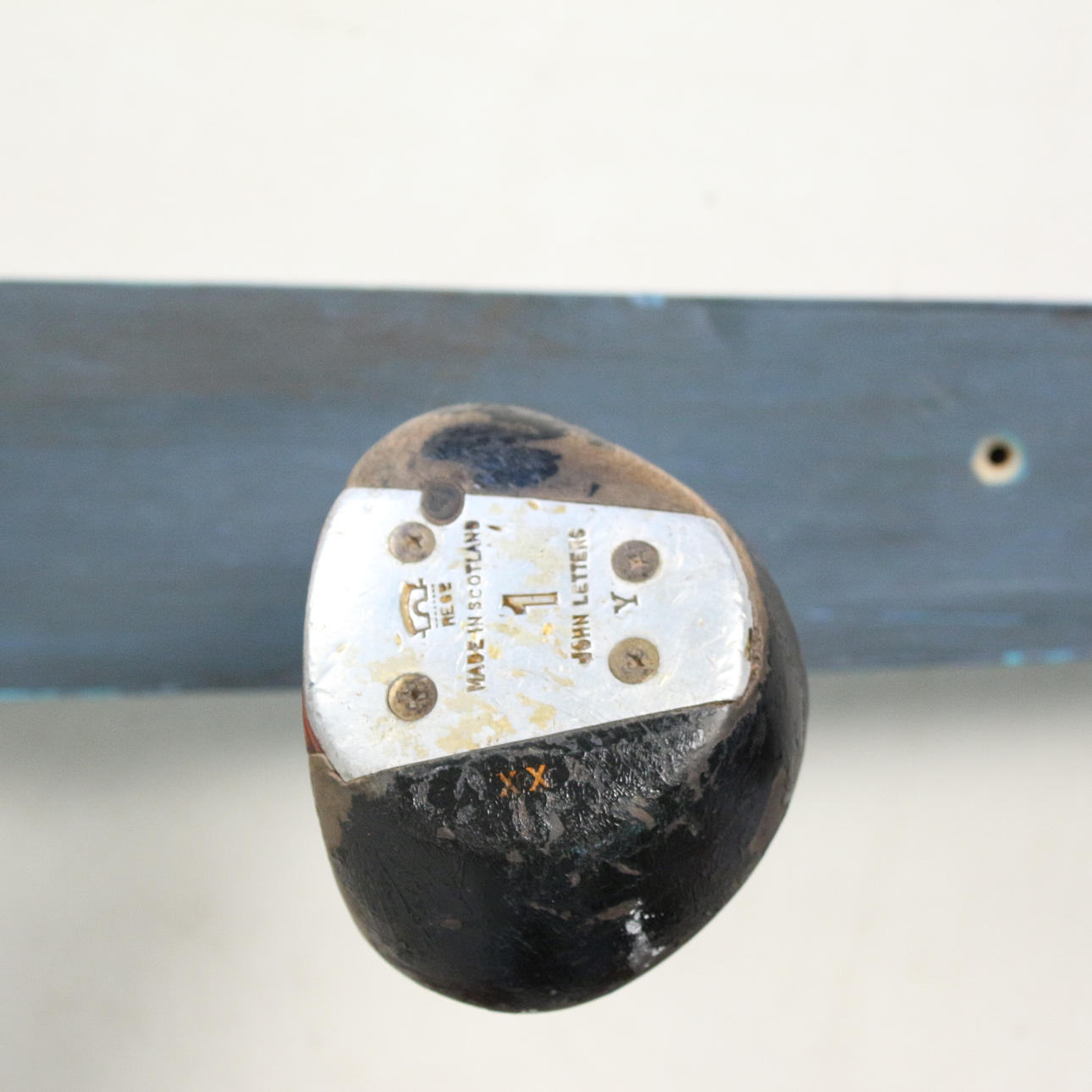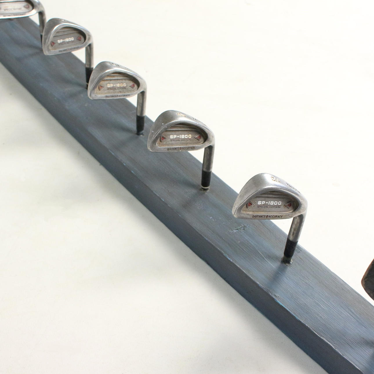 Garderobe 'Golfschläger', Unikat, mit 9 Haken, montiert auf einem Holzbrett, lackiert,