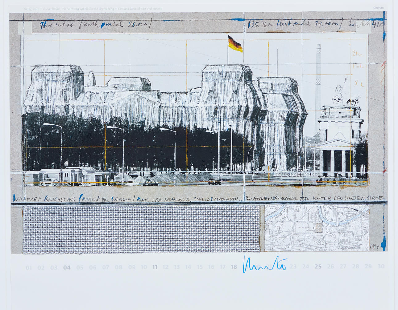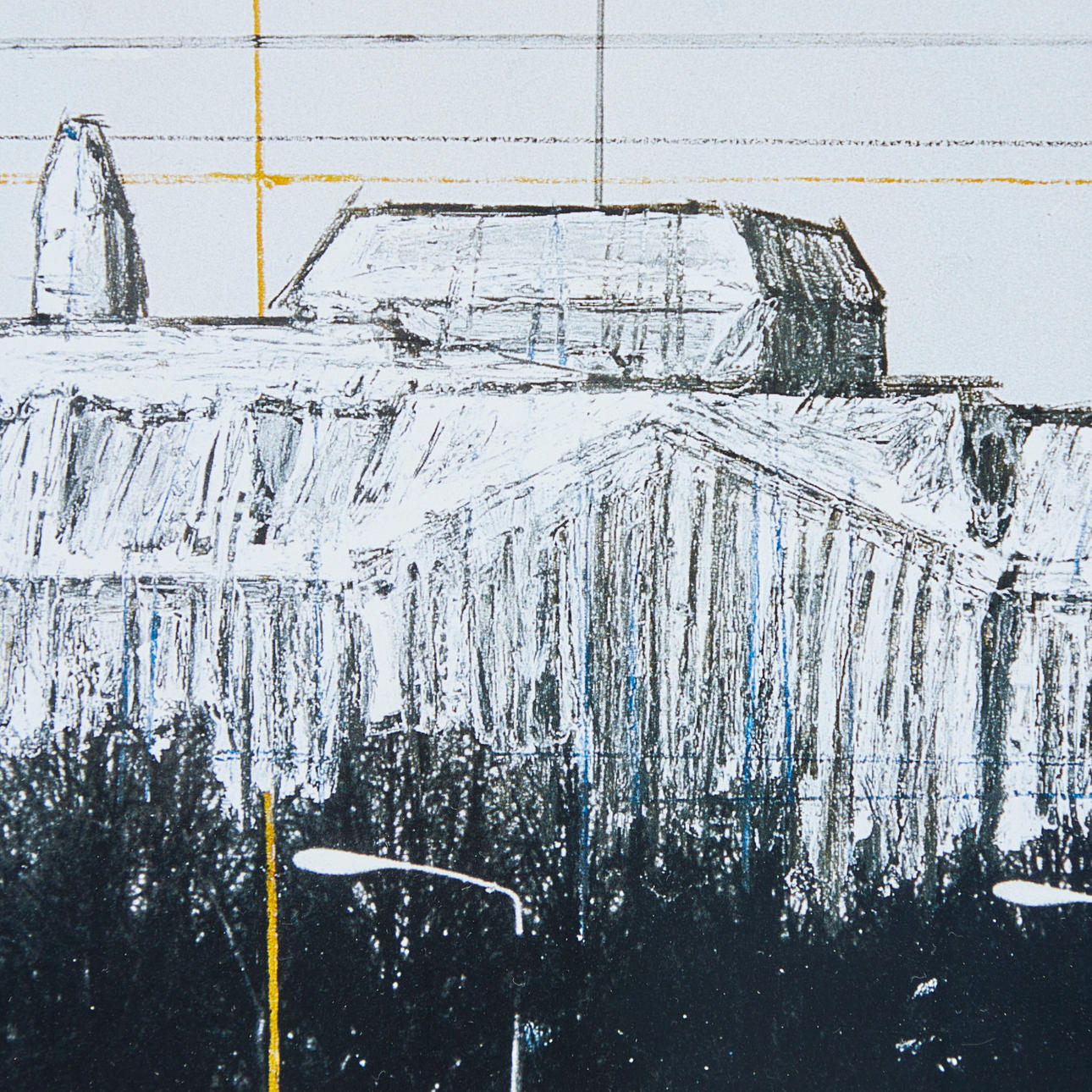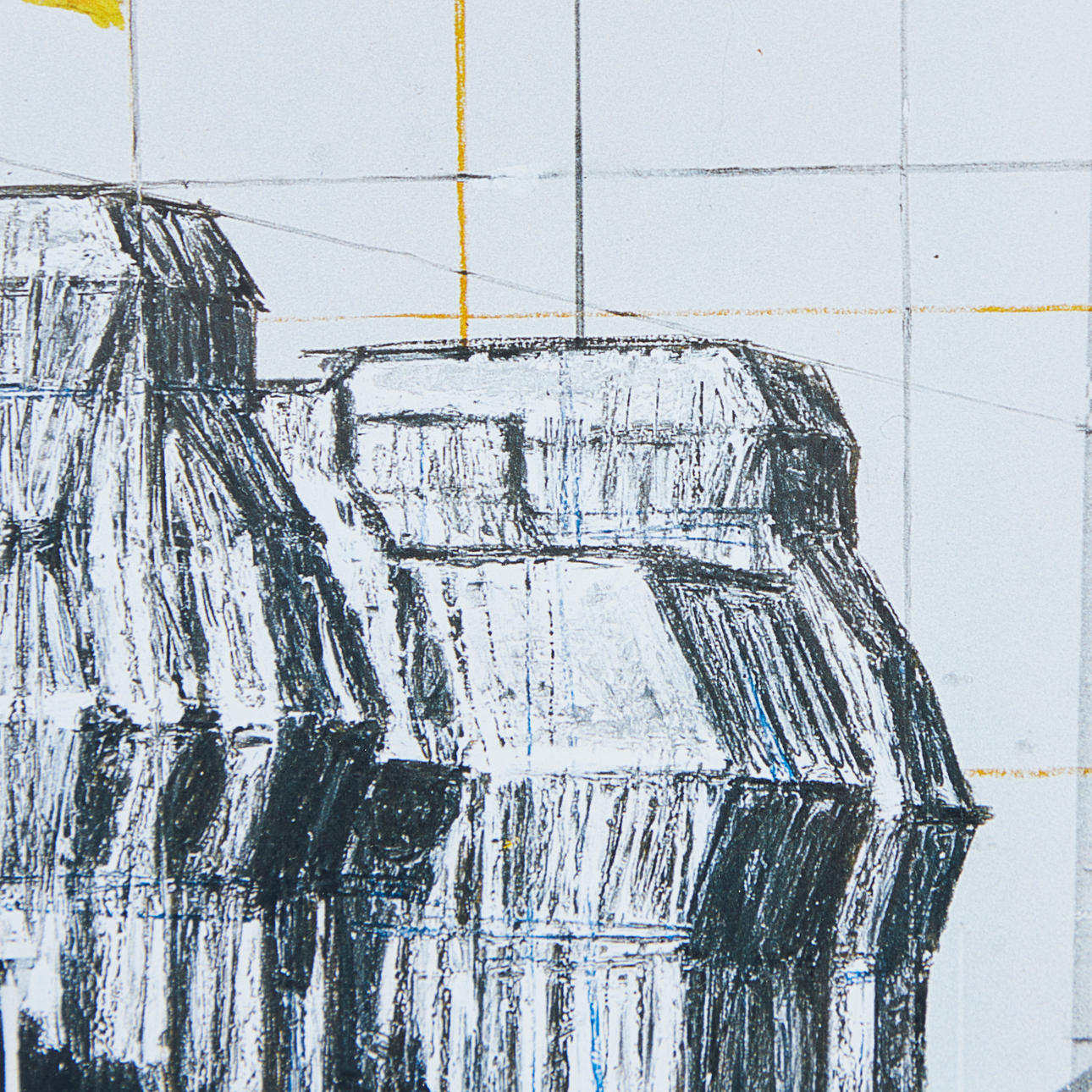Christo / Christo Javacheff (1935-2020), Farblithographie, 'Wrapped Reichstag'. Darstellung des verhüllten Reichstags, oben mit einem Schriftzug bezeichnet sowie unten signiert, 46x55,5cm (62x72cm).