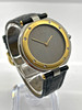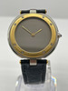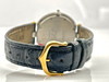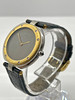 Stahl- und Goldgehäuse mit 32 mm Durchmesser. Lederband mit Schnallenverschluss. Beide originell. Lünette aus 18 Karat Gold. Quarzwerk.