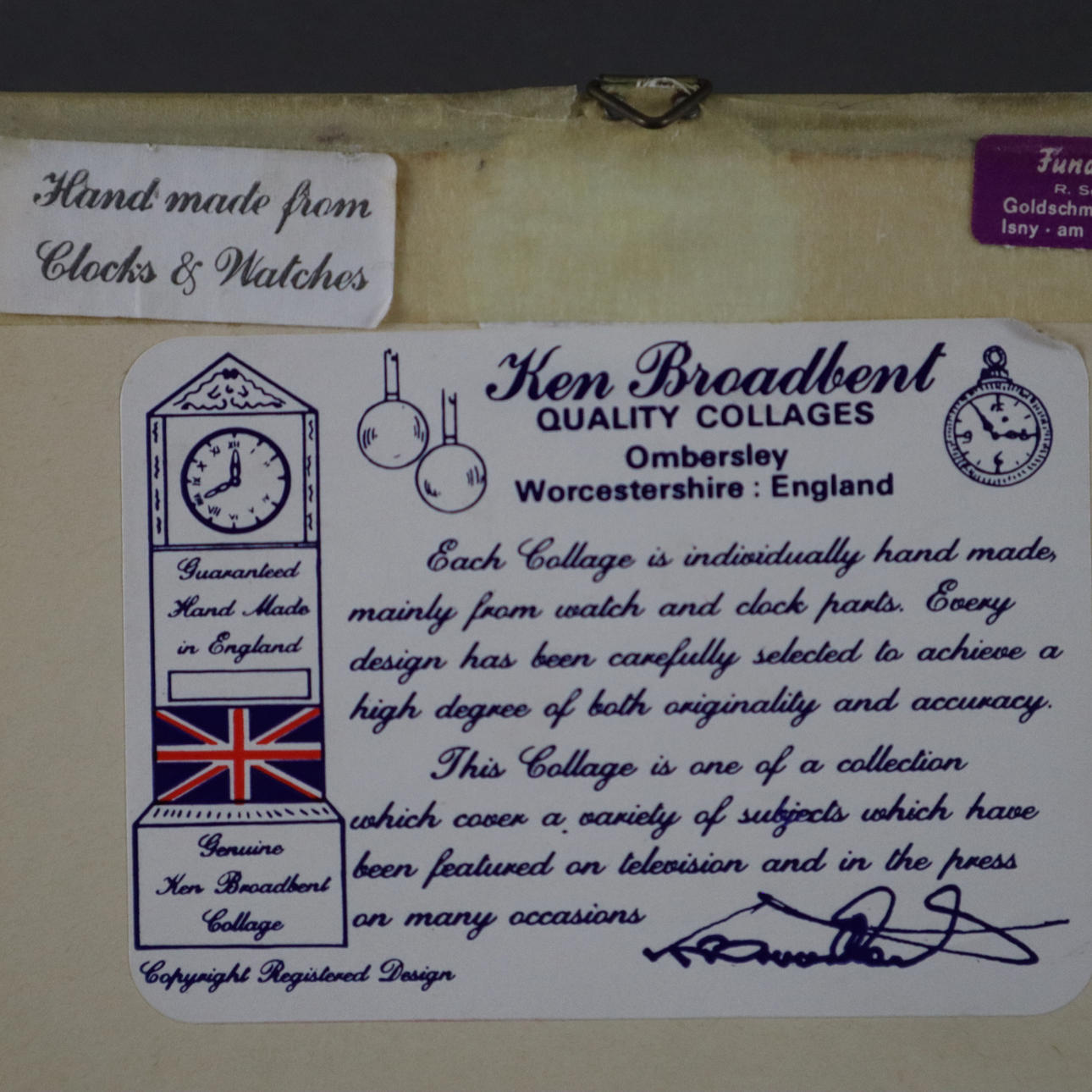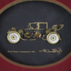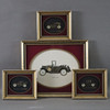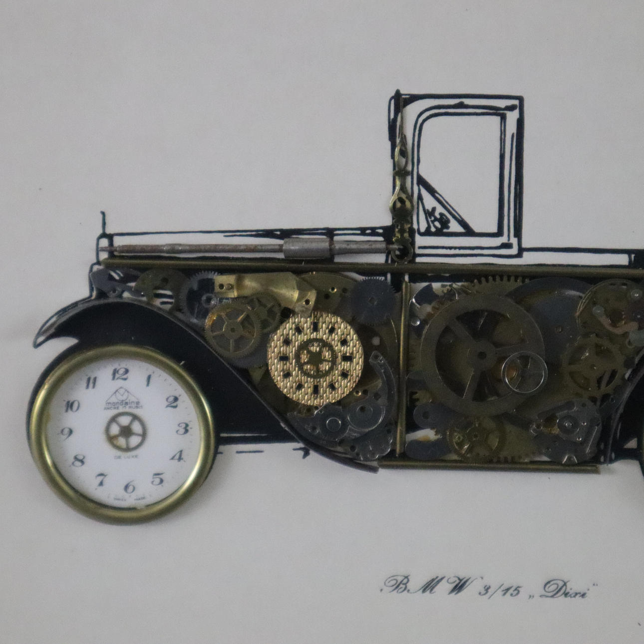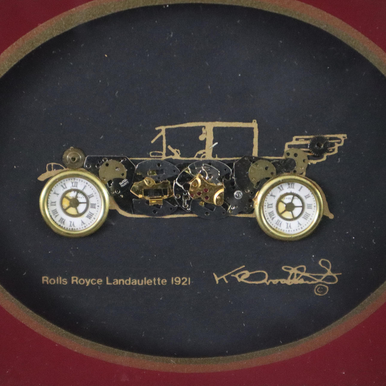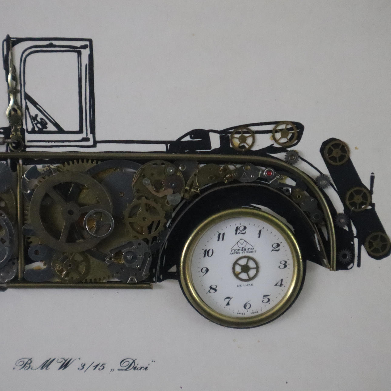 Entwurf: Ken Broadbent, Collagen aus Uhrenteilen, dabei "BMW 3/15 'Dixi'", "Rolls Royce Landaulette 1921", "Rolls Royce Phantom Tourer 1927", "Chevrolet Coupe 1912", dekorative Rahmen, Gesamtmaße ca. 14,3 x 17 bis 28,2 x 33,2 cm.