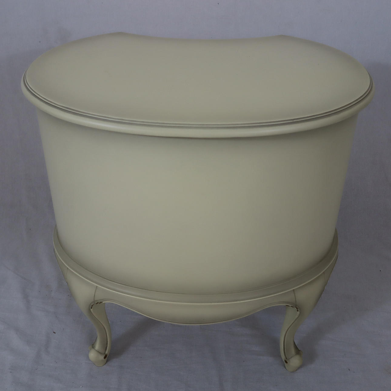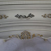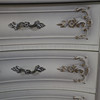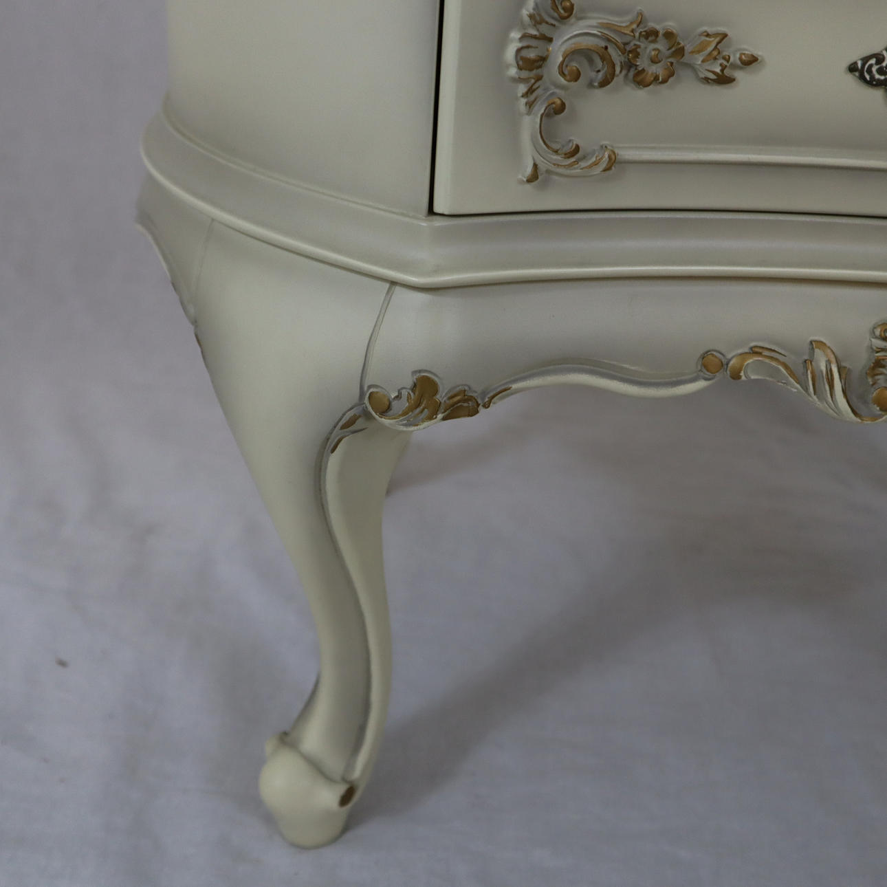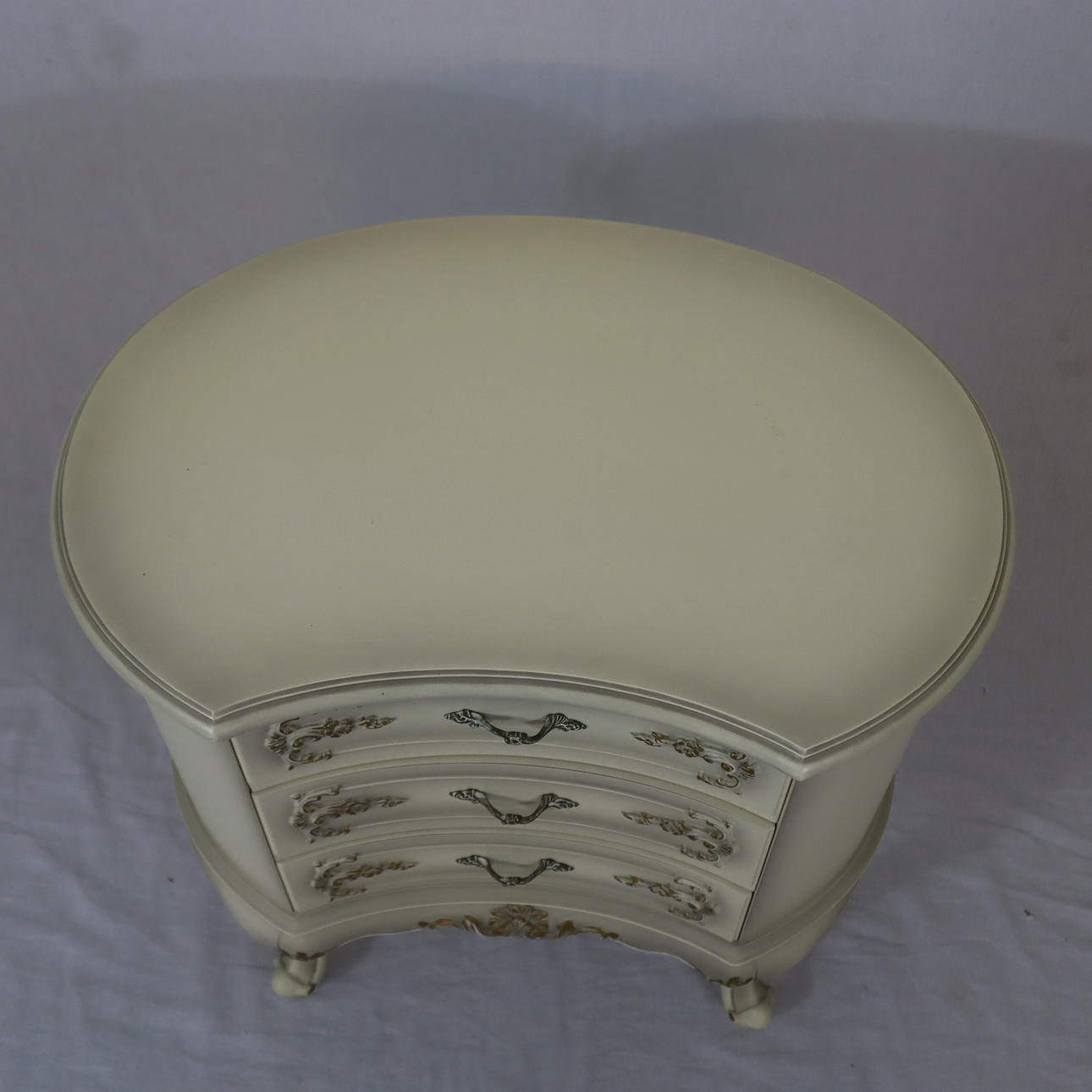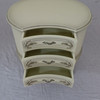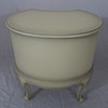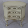 Schleiflack-Oberfläche in Altweiß mit erhabener vergoldeter Rocaillenzier, konkaver, dreischübiger Korpus auf vier geschweiften Füßen, HxBxT:ca.65x63x47cm.