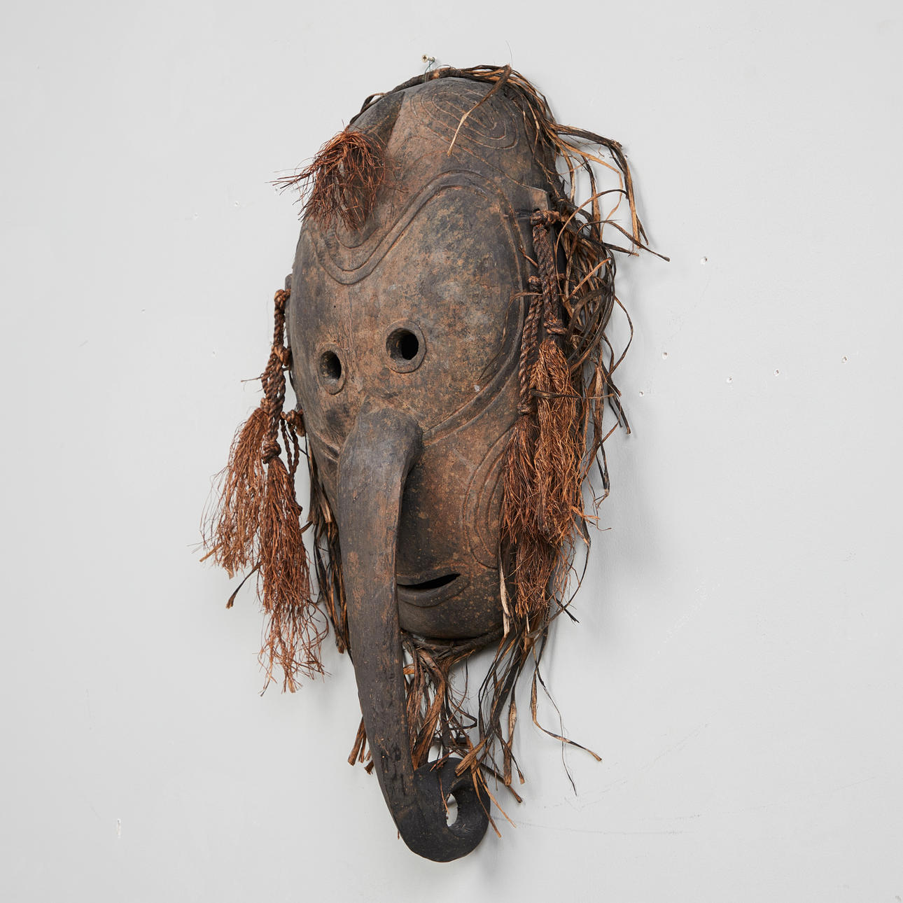 Maske, Holz, Papua-Neuguinea. Maske gefertigt aus Holz, mit ornamentaler Schnitzerei versehen und einem Rüssel, partiell mit Behaarung versehen, L.65,5cm, B.32cm, T.12,5cm.