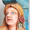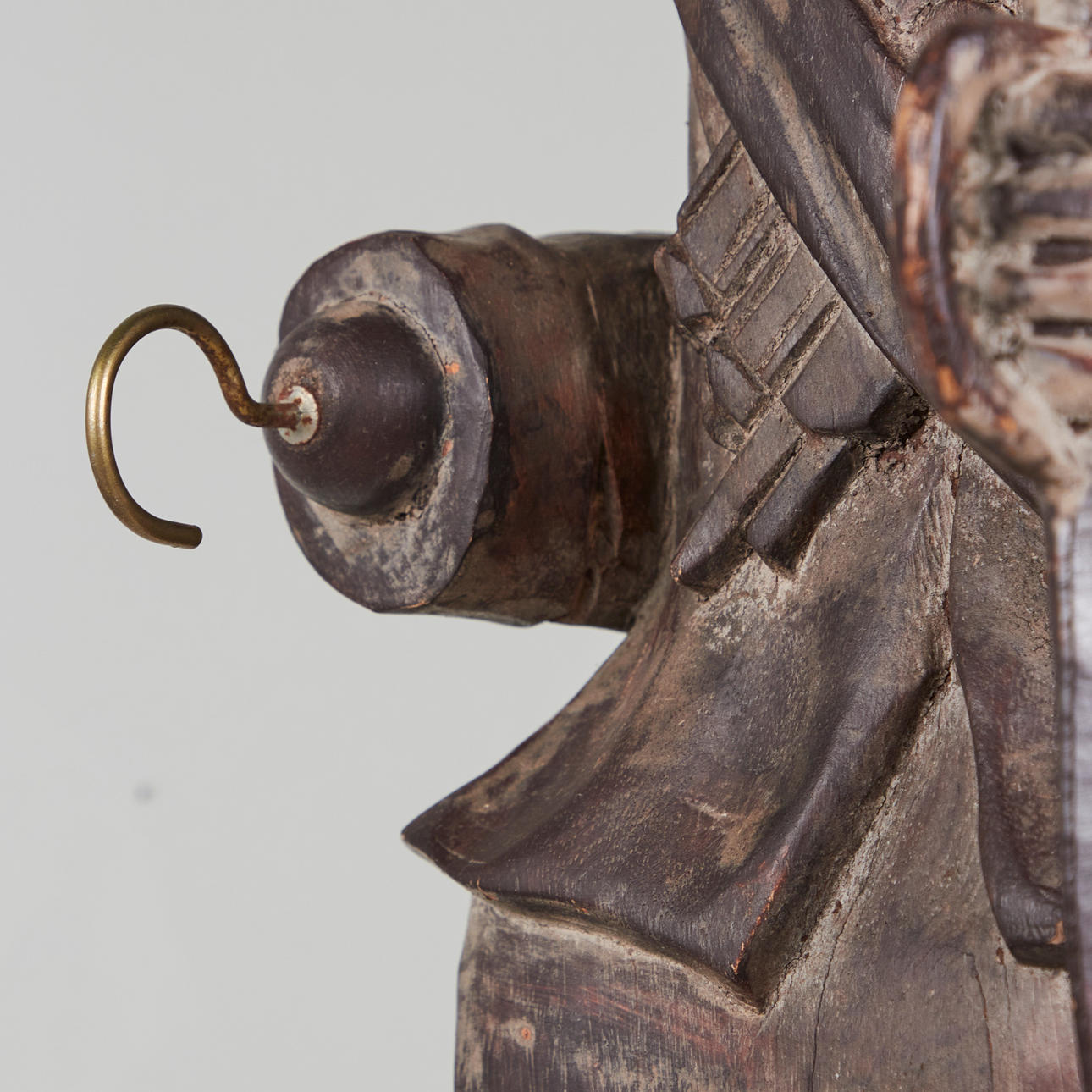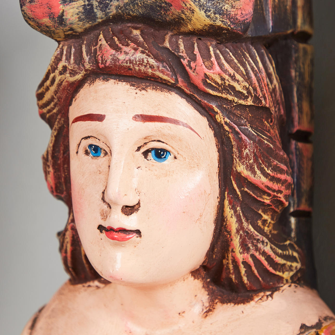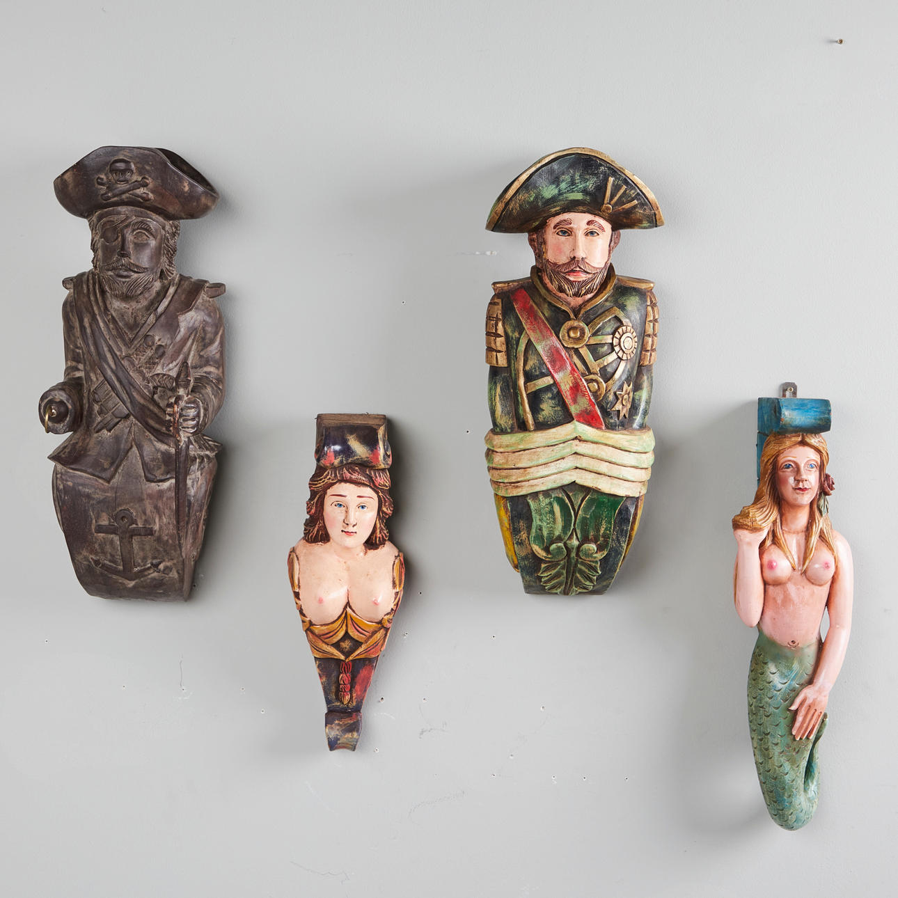 Konvolut, Wandobjekte / Galionsfiguren, Holz. Konvolut bestehend aus vier aus Holz geschnitzten Wandojekten in Form von zwei männlichen und zwei weiblichen Galinonsfiguren, drei von ihnen mit polychromer Staffage sowie jeweils rückseitig mit einer Aufhängevorrichtung versehen, H.45-61cm, B.15-22cm, T.16-20cm (4).
