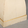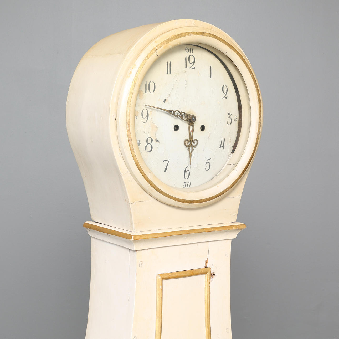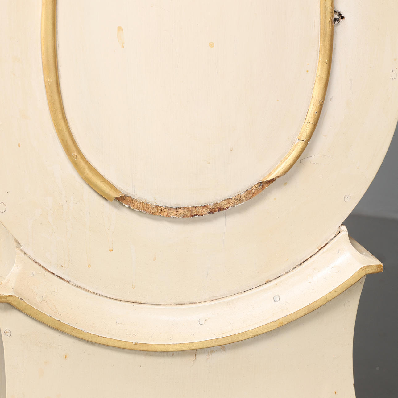 Standuhr aus weiß lackiertem Holz, ungemarktes Werk und Zifferblatt.