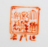 Porzellan mit koralleroter Manufakturmarke, glattrandiger Fahnenteller mit polychromer Fasanenpaar u. Blüten Malerei auf optisch krakeliertem Grund, Goldrand, Ø ca. 25,5 cm.