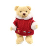 beigefarbener, mohairbespannter Körper, mit Brummstimme, limitierte Auflage 183/1500, mit rot-weißem Pullover, rechte Fußballen bestickt „Harrods 2009“, nummerierte Ohrmarke mit vergoldetem Knopf im Ohr, 32cm, im Karton mit Zertifikat, 39 cm x 24 cm x 16 cm.