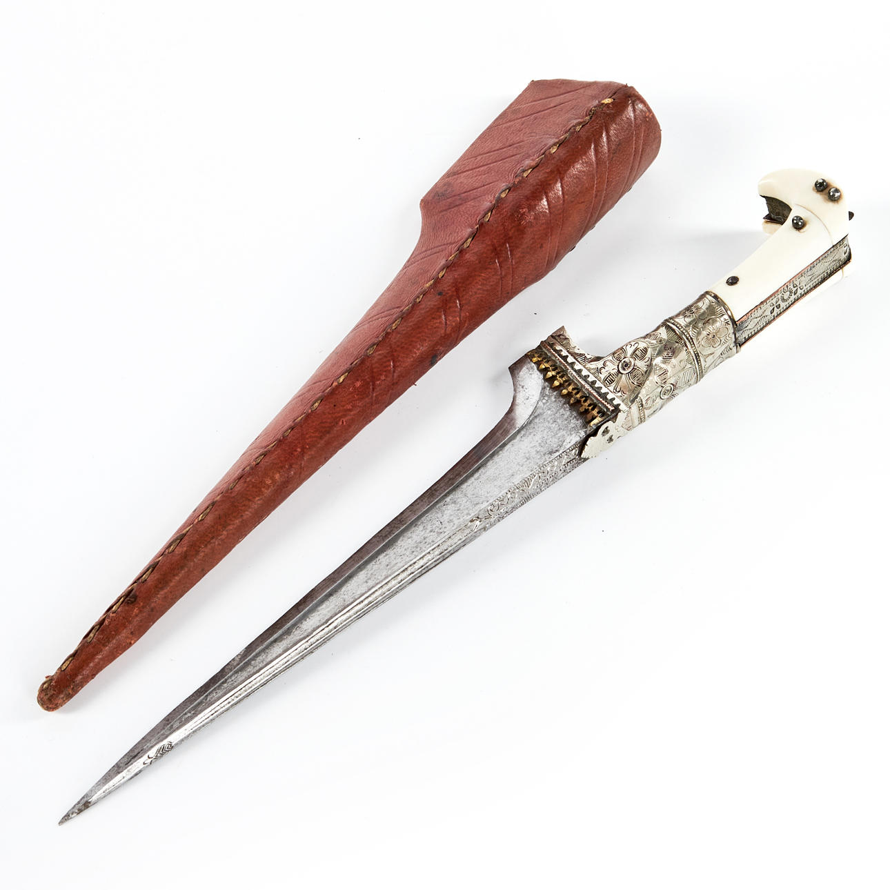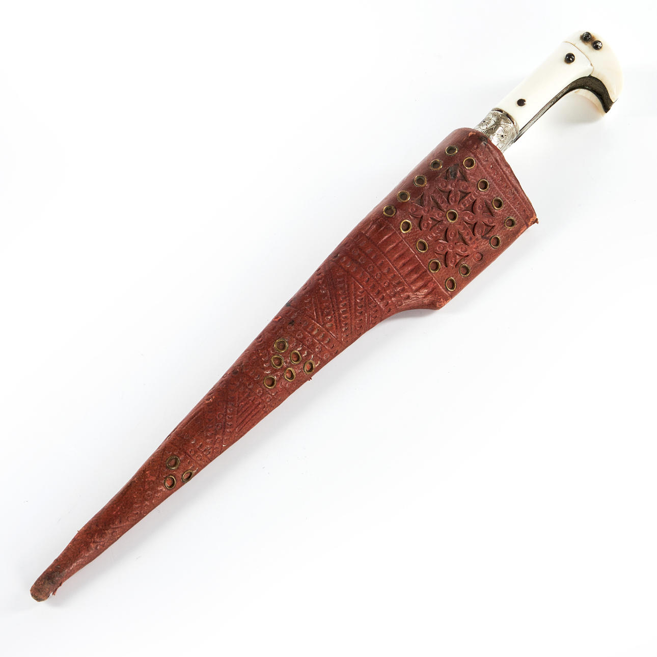 Hornm versilbertes Kupfer, Lederscheide. Wahrscheinlich erste Hälfte des 20. Jahrhunderts, Länge 37 cm. Auch in Nordafrika unter dem Namen Karud beliebt.