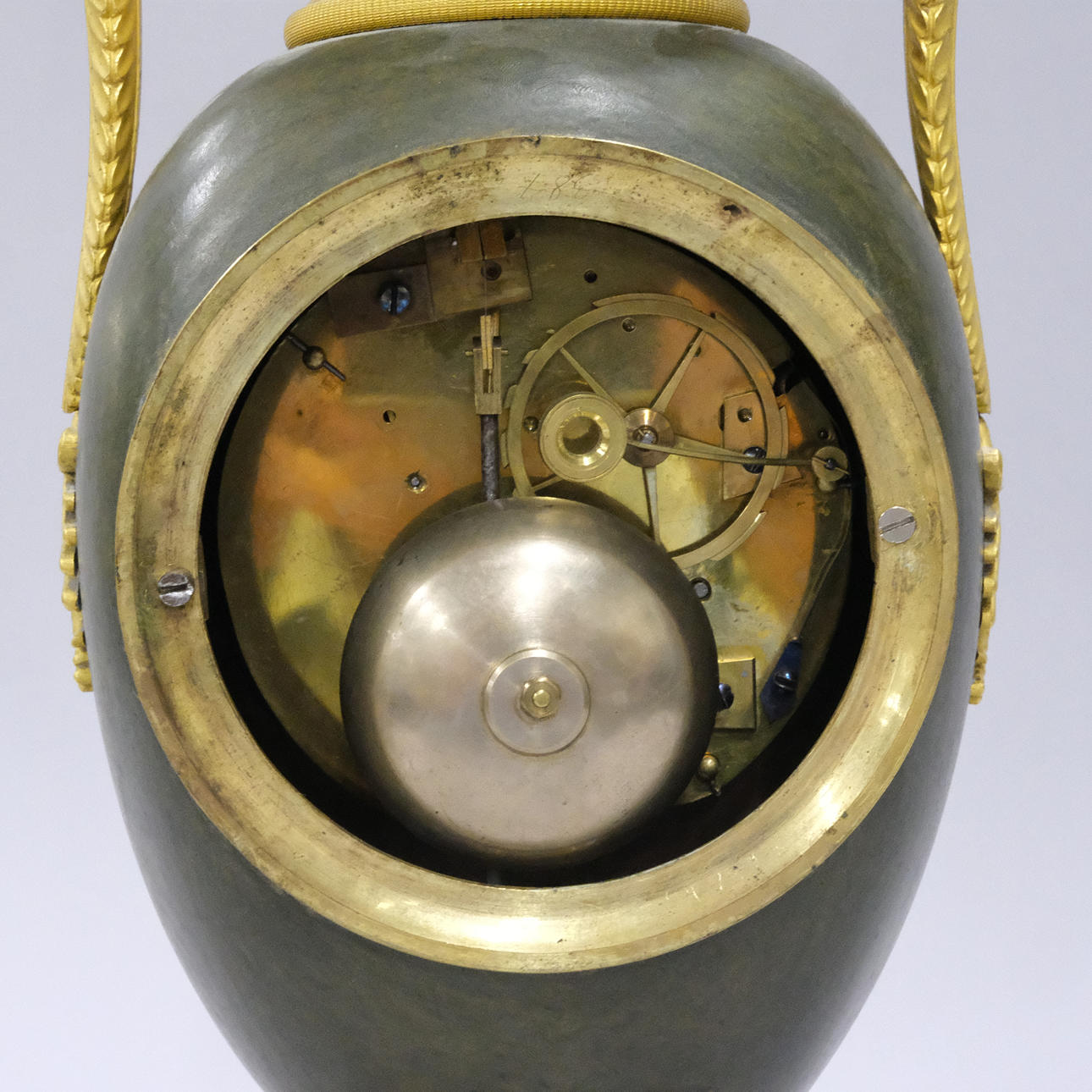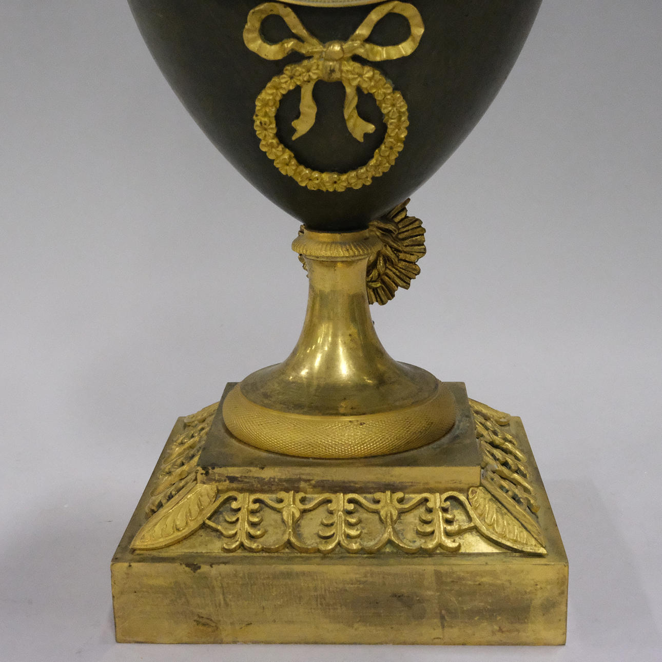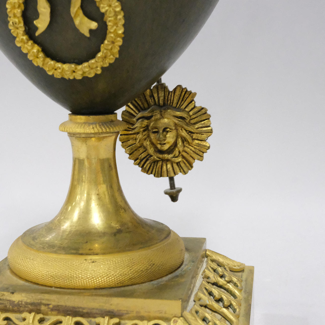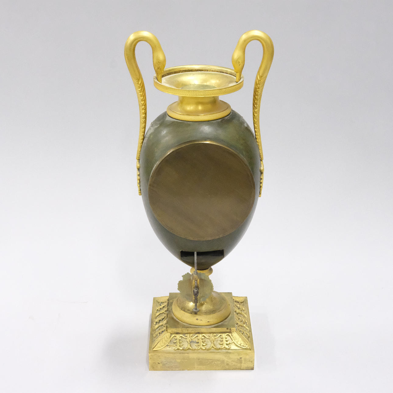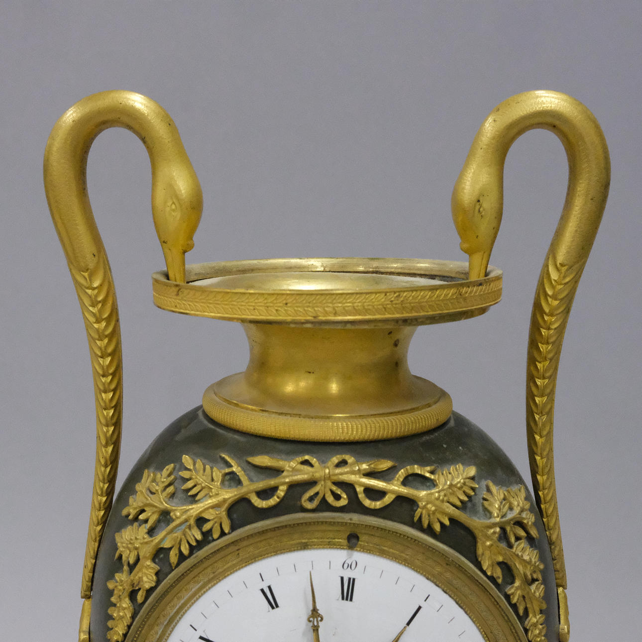 Vergoldetes Messing und patiniertes Metall, Dekoration mit Schwanenköpfen und Girlanden, 19. Jahrhundert, Höhe 38 cm.