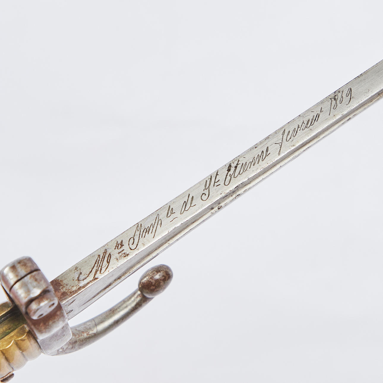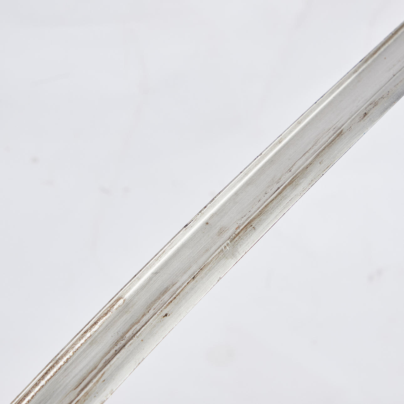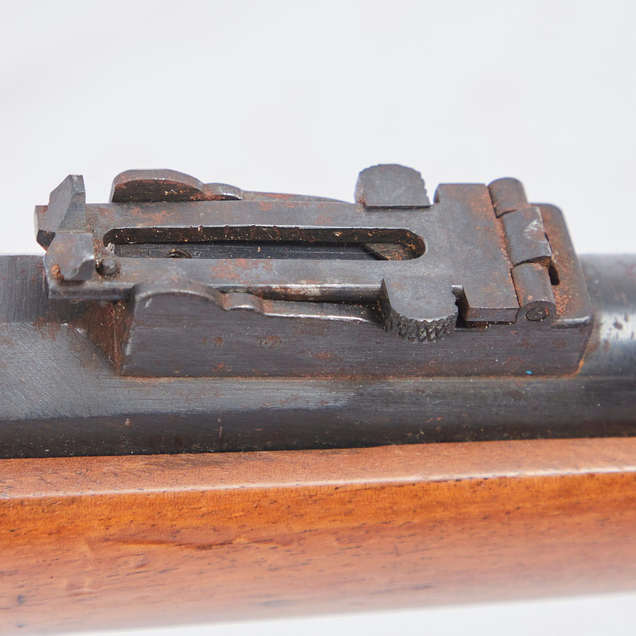 Altersgemäße Gebrauchs- und Reibespuren, partielle Kratzer im Holz, starke Oxidationsspuren im Eisen.