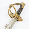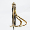 Pallasch mit einer Klinge aus Eisen und einem Bügel aus Messing, Griff aus Holz mit Messing-Draht umwickelt, Scheide aus Eisen, zwei Trageringe für Tragevorrichtung, Gesamtlänge: 80cm, Klingenlänge: ca. 64.5cm, Klingenbreite: ca. 2cm.