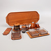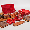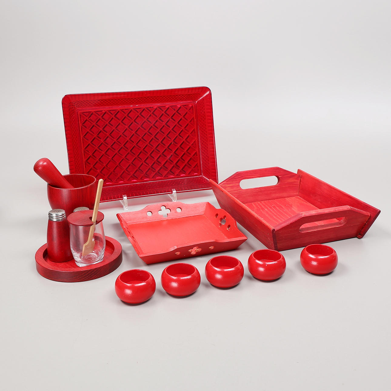 4 Tabletts, Marmeladenglas, Papierhalter, Glas mit Löffel, Glasschale auf Tablett und 4 Leuchter, Teak und Rote Bete, unmarkierte maximale Höhe 11 cm.