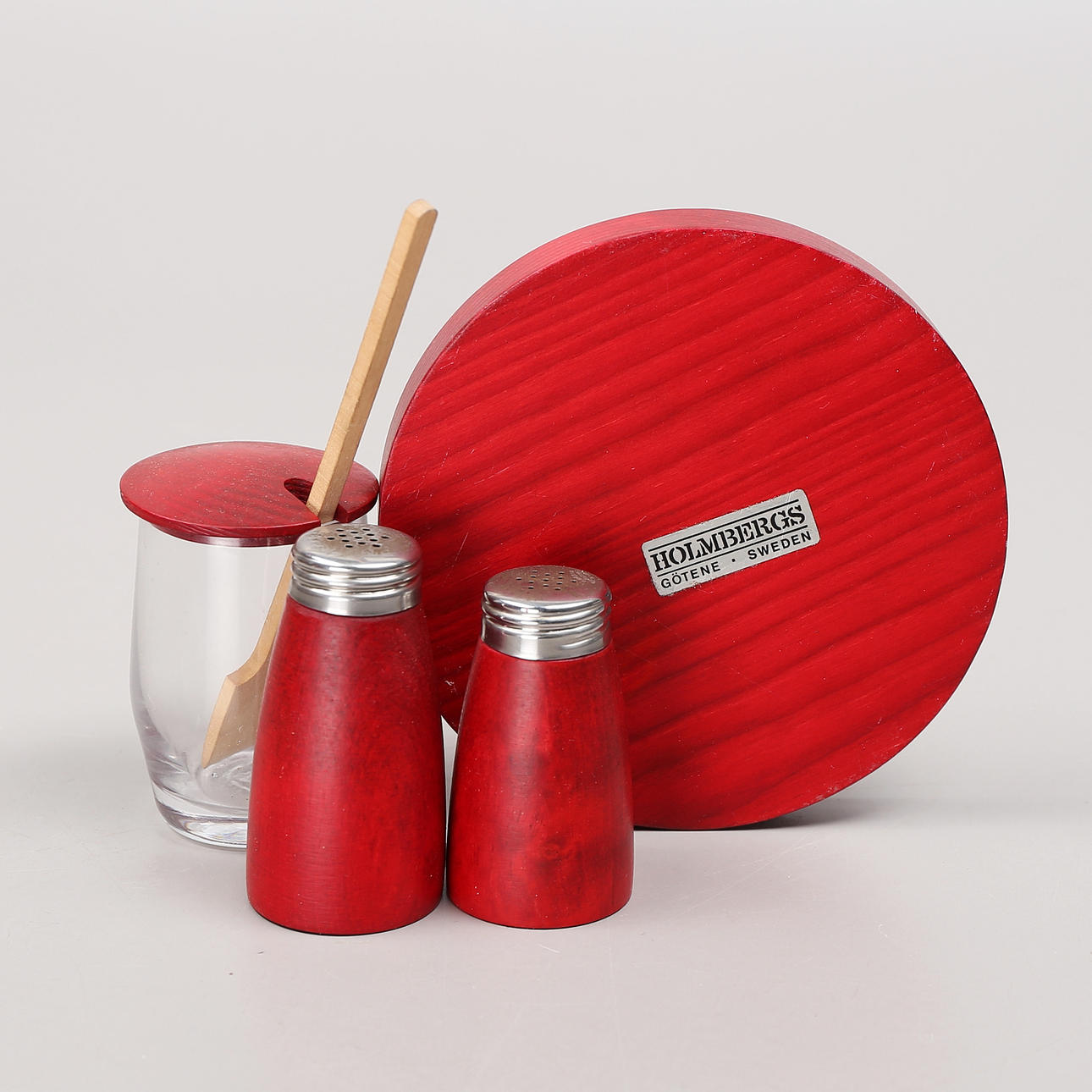 2 Gewürzregale, Tablett mit Schalen, Mörser mit Stößel, Glaskrug auf Schale, Blaugrün und Rote Bete, Karl Holmberg, beschriftet maximale Höhe 14 cm.