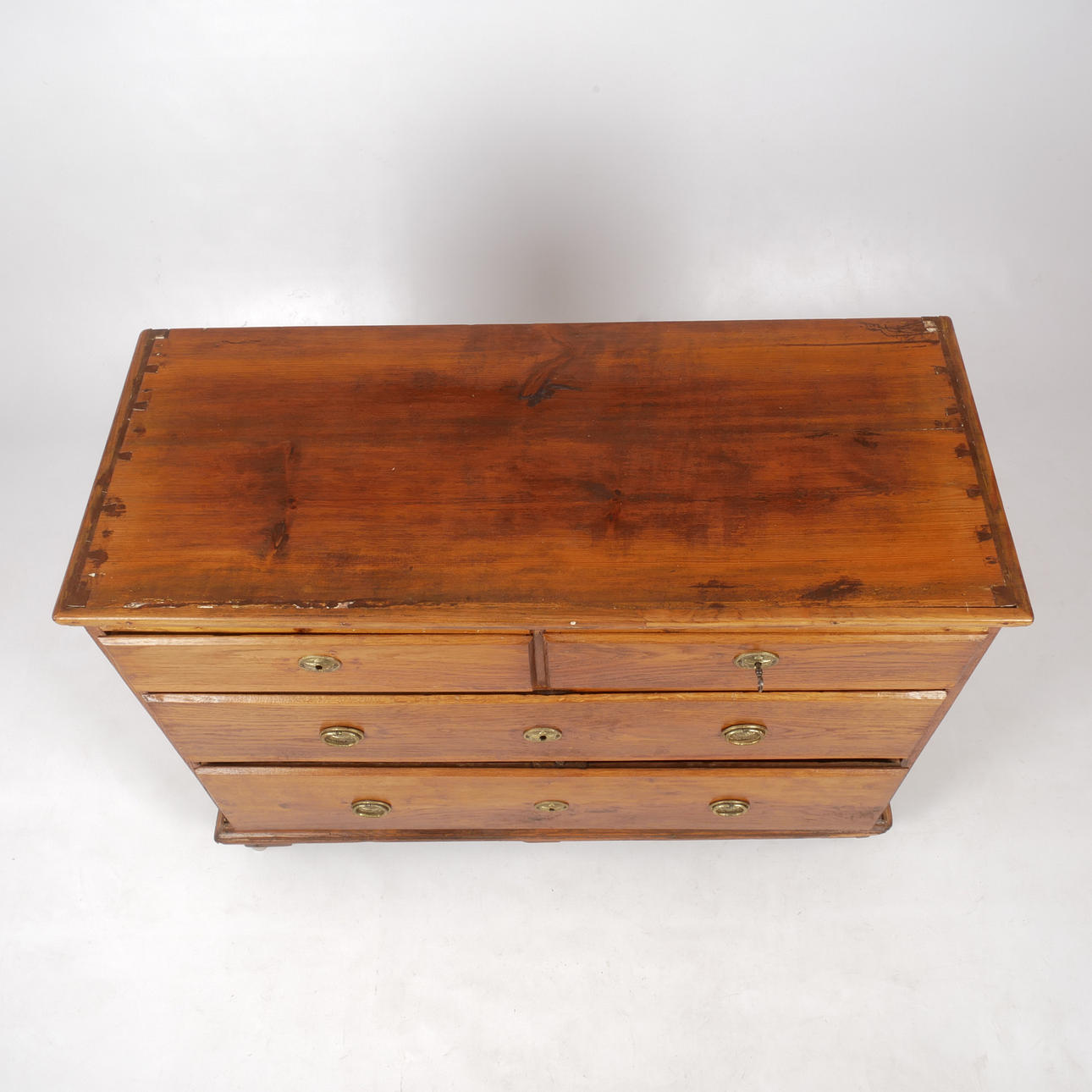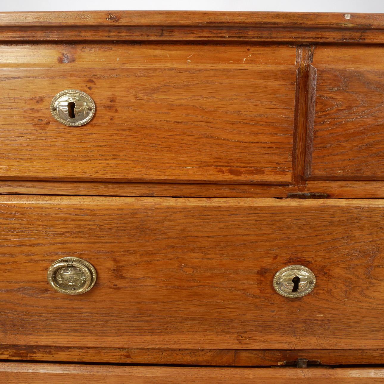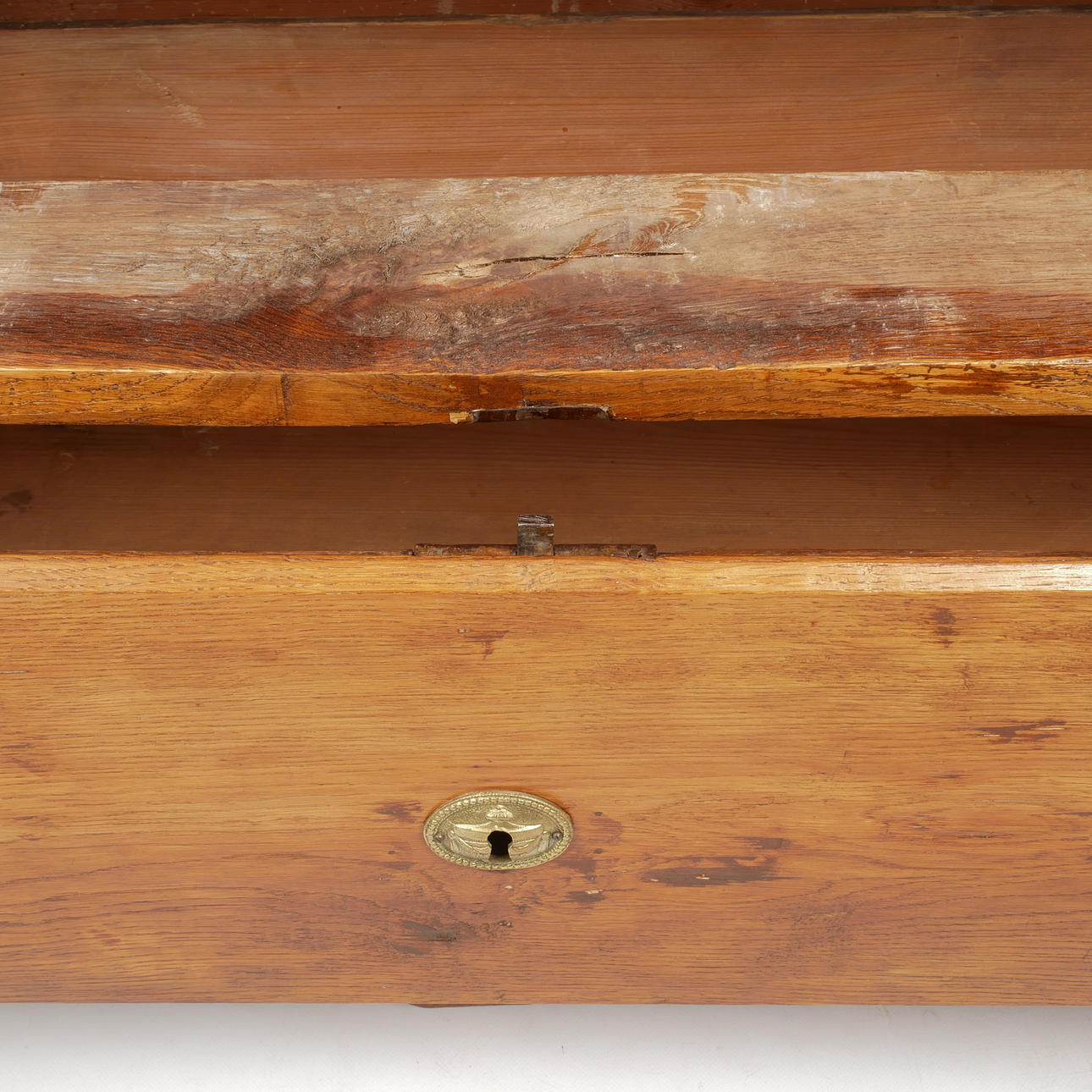 Altersbedingter Verschleiß. Untere Schubladen ohne Schlüssel, untere Schublade entriegelt, aber mit Verriegelungsbolzen in eingeklappter Position. Oberes Schubladenpaar mit Schlüssel und später funktionierendem Schloss. Scheibe mit Beschädigung, Vorderkante der Scheibe mit Löchern von einem fehlenden Stecker.