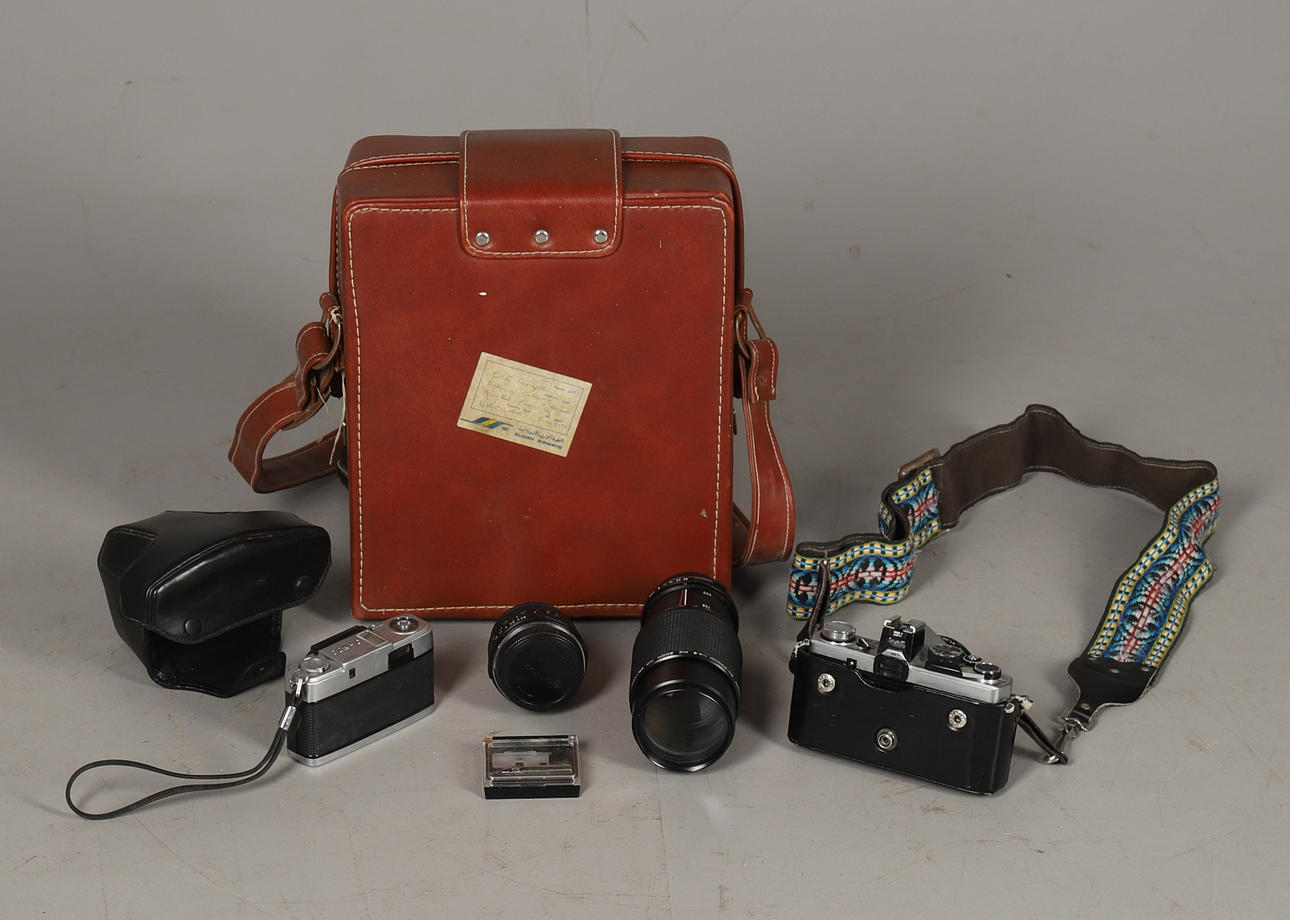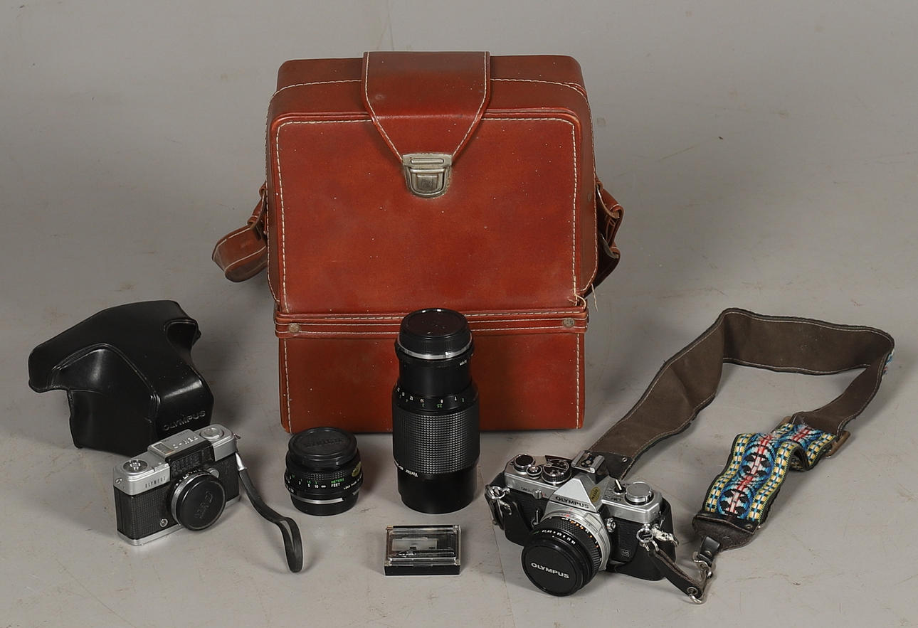EINE OLYMPUS OM-2 KAMERA IN HELLBRAUNEM LEDERTASCHE, EINE MENGE OBJEKTIVE UND EINE WEITERE OLYMPUS KAMERA.