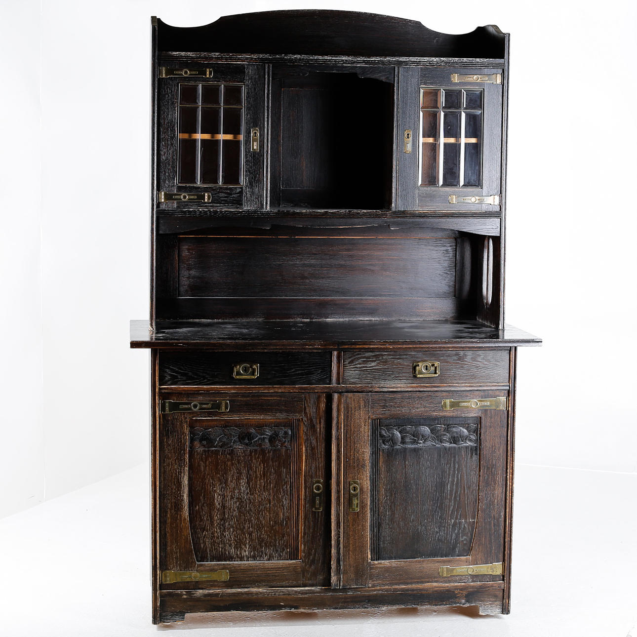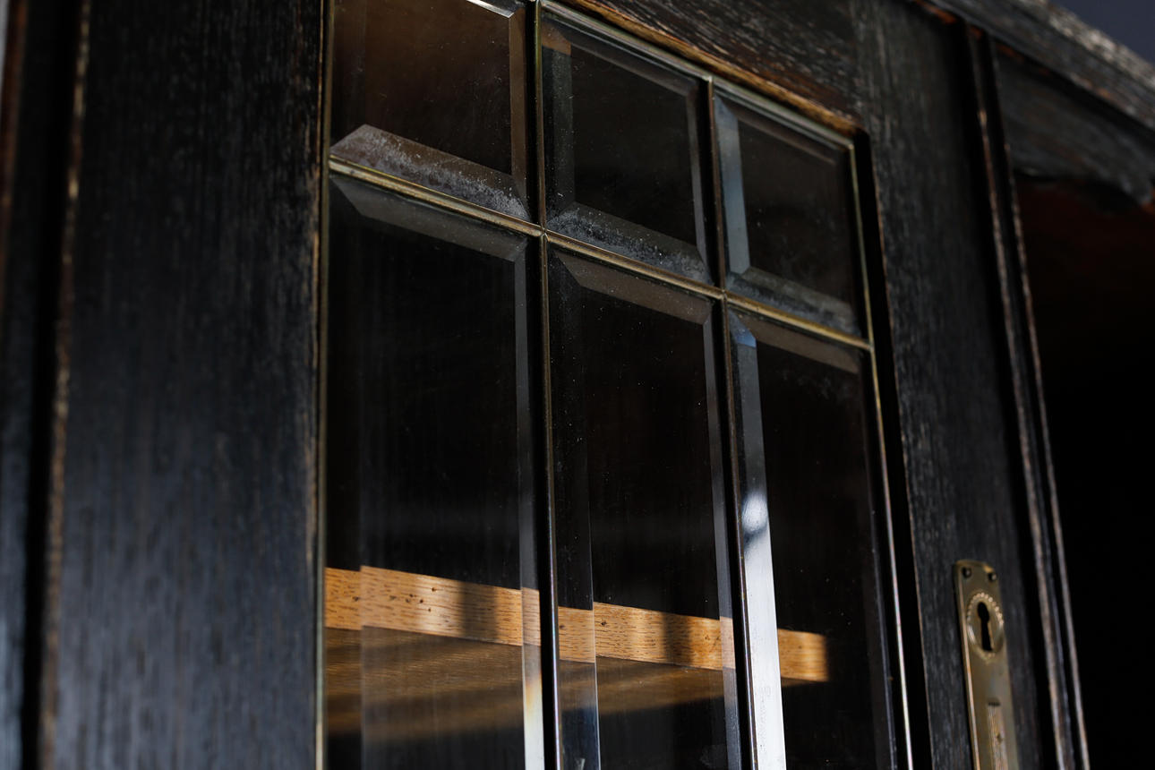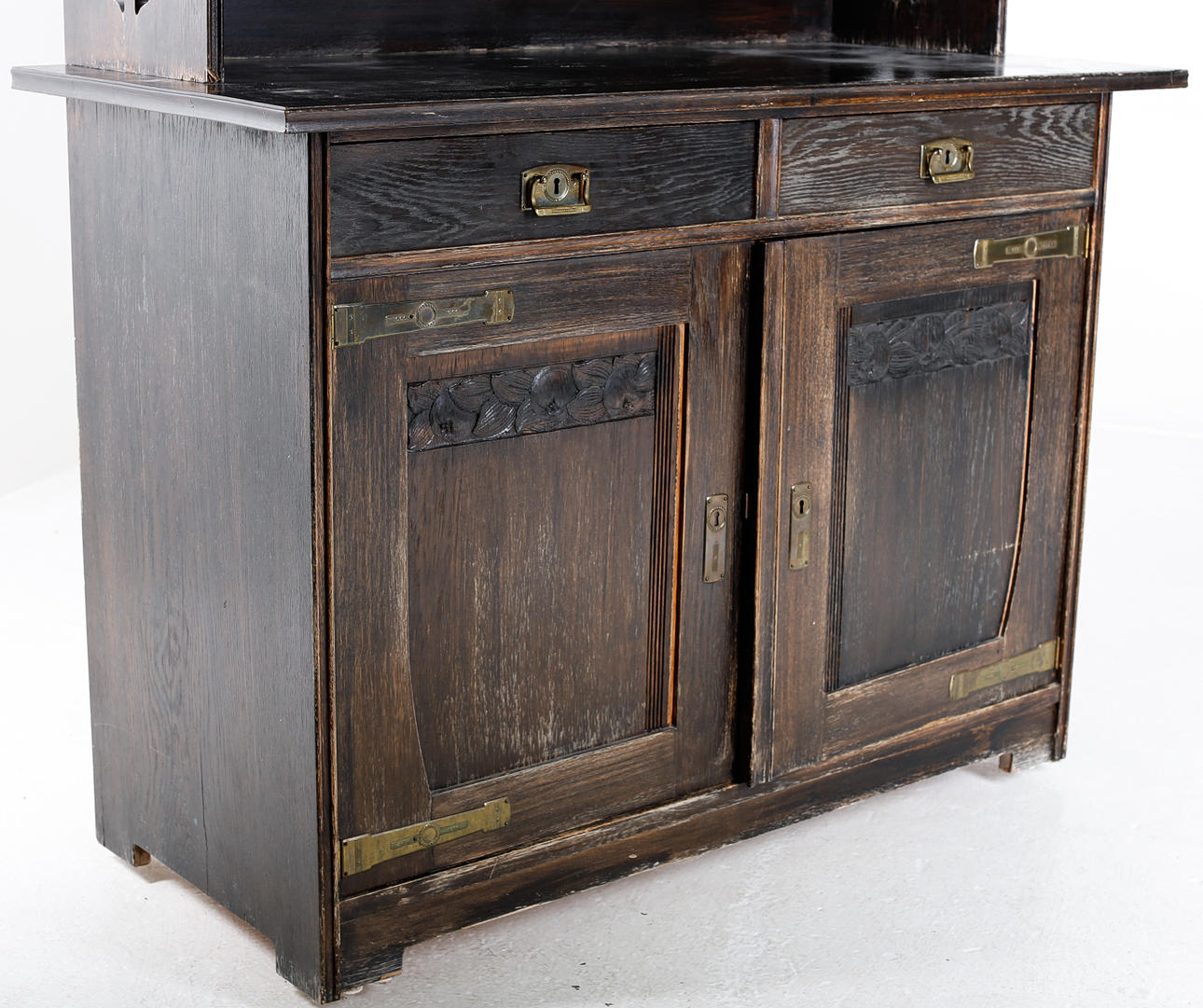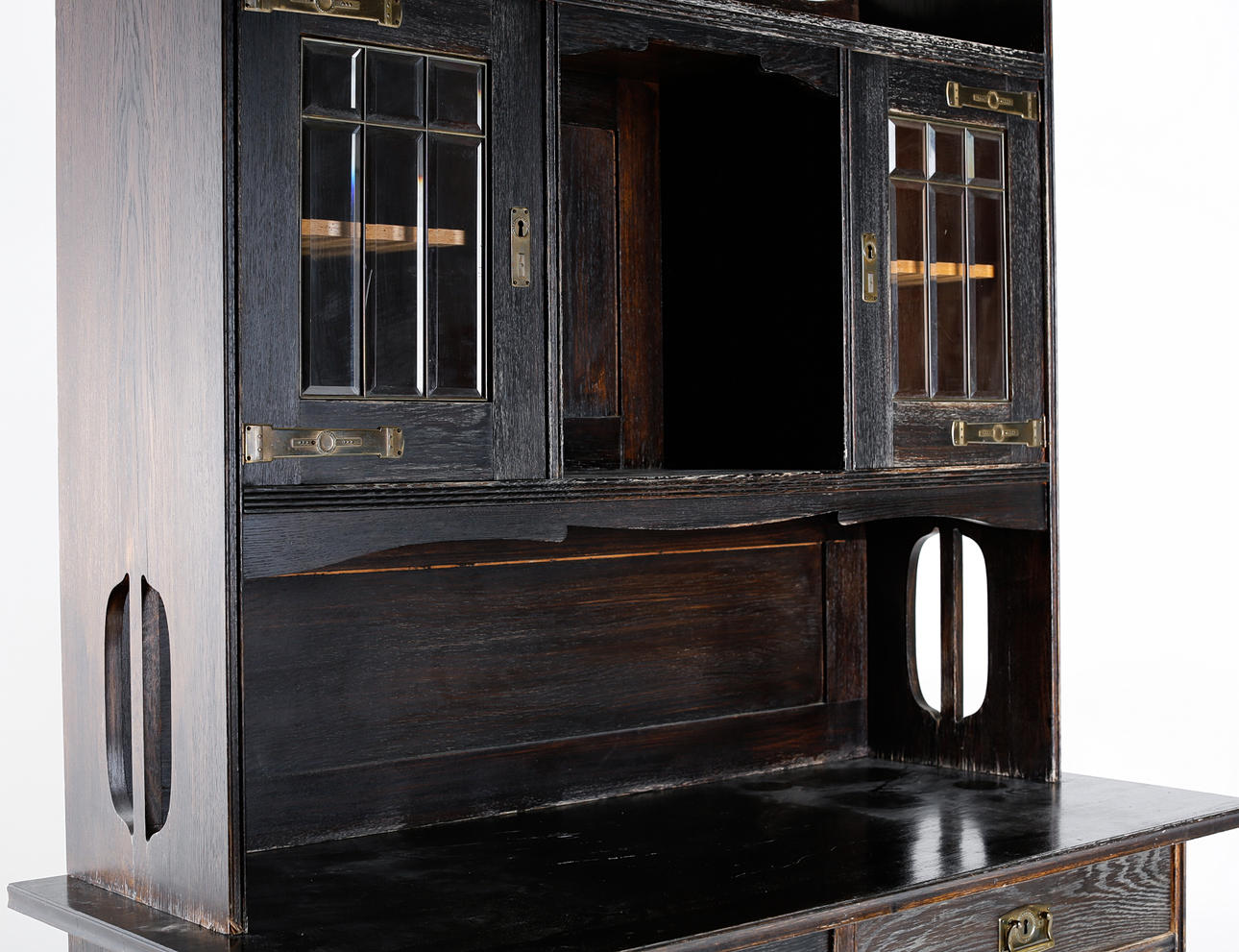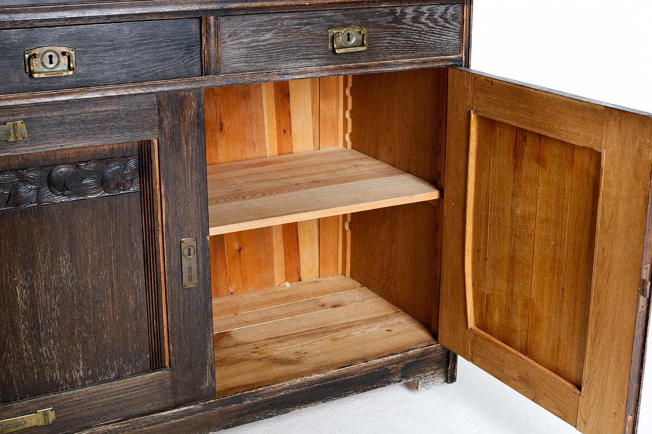 Verschleiß, Farbabrieb, Markierungen, kleinere Furnierschäden. Trockenrisse sind vorhanden.