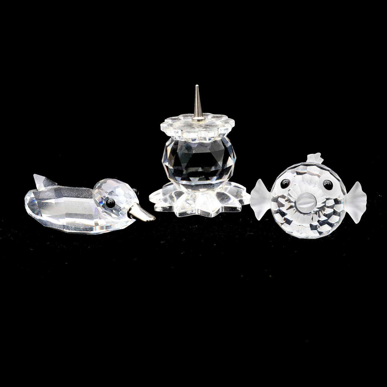 Nummer 13960, klein, aus klarem, facettiertem Kristall mit mattiertem Schwanz und Flossen sowie schwarzen Augen, 3 cm, in Originalverpackung mit Zertifikat, zusammen Baby Dolphin – Aquatic Worlds, Nummer 678507, hergestellt aus klarem, facettiertem Kristall mit blauen Kristallaugen, 4,5 cm im Original Box, Gold Balance Scales – Crystal Memories, Nummer 272709, 4,5 cm mm, in Originalbox, großer Hund Pluto, Nummer 010024, mit klarem Kristallkörper mit schwarzen Augen und Nase, 7 cm, Mini-Ente mit Metallschnabel, Nummer 010032, hergestellt aus klarer, facettierter Kristall mit silbernem Metallschnabel und schwarzen Augen, 5 cm, Kleiner Schwan, Nummer 015152, hergestellt aus klarem, facettiertem Kristall, 3 cm, Große Schildkröte, Nummer 010037, klarer, facettierter Kristall mit grünen Augen, 6 cm, ein Swarovski-Kerzenhalter, 4 cm und ein Swarovski Kris Bär, 4 cm (9).
