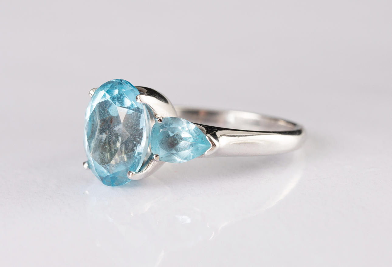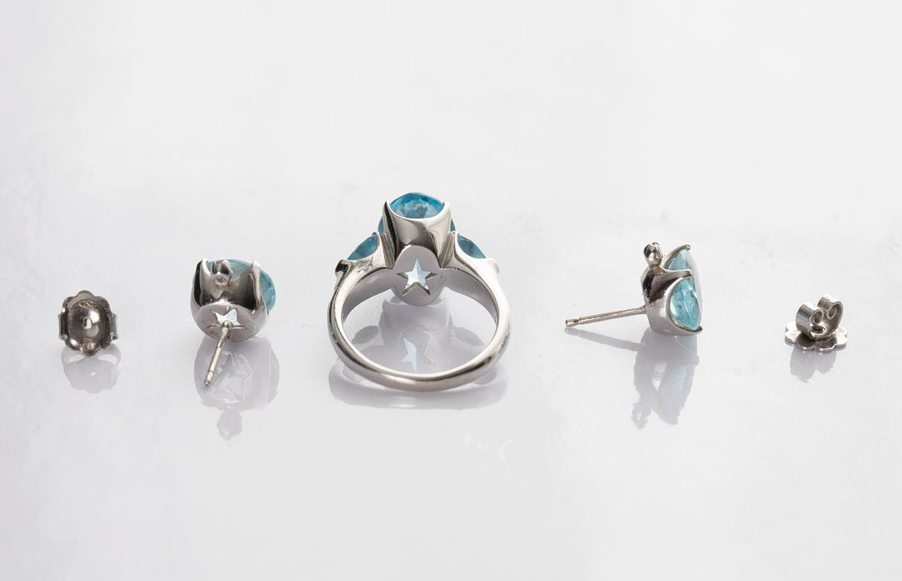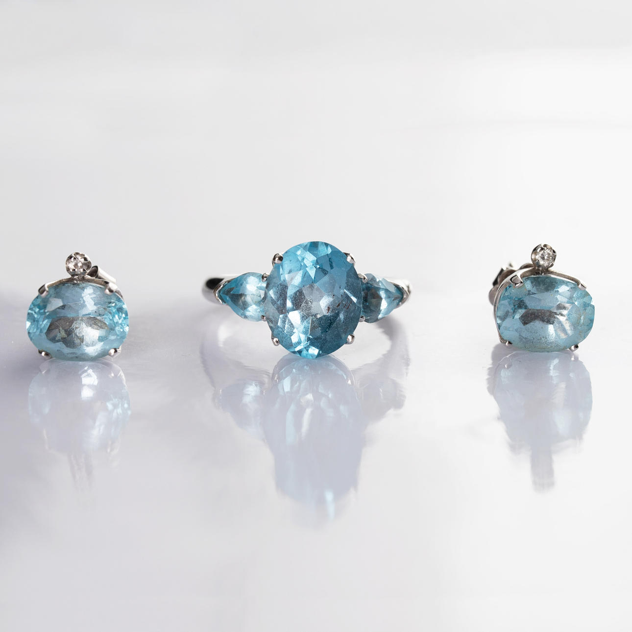 Schmuckset von 'H.Stern' gefertigt aus 750er Gold, bestehend aus 1 Ring besetzt mit 3 Topasen von insgesamt ca. 5.75 ct und 1 Paar Ohrringe besetzt mit 2 Topasen von insgesamt ca. 6.40 ct. Ring und Ohrringe jeweils mit einem Diamant besetzt. Ringgröße ca. 57. Gesamtgewicht ca. 11,5 Gramm.
