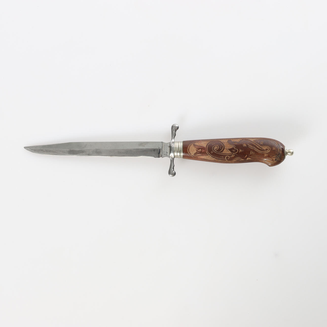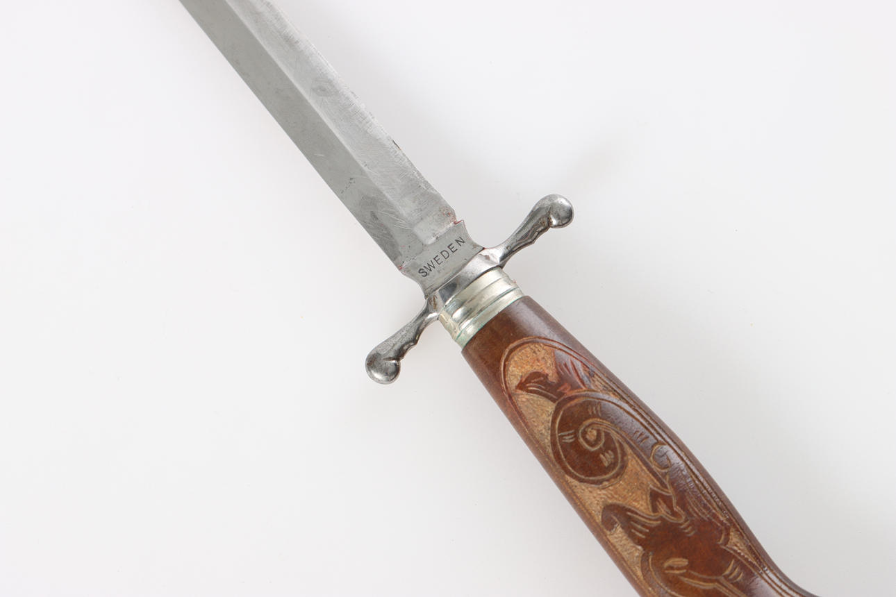 Einschneidiges Messer mit geschnitztem Holzgriff. Klinge markiert P Holmberg Eskilstuna, Schweden.