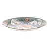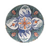 mit einem zentralen stilisierten Blütenkopf, umgeben von vier herzförmigen, mit Blumen und Bäumen gefüllten Feldern, die auf einem gesprenkelten grünen Grund zurückgehalten und von ovalen, sich wiederholenden Motiven dazwischen angeordnet sind, 30,5 cm Durchmesser, blau gemaltes „II“ auf der Rückseite.