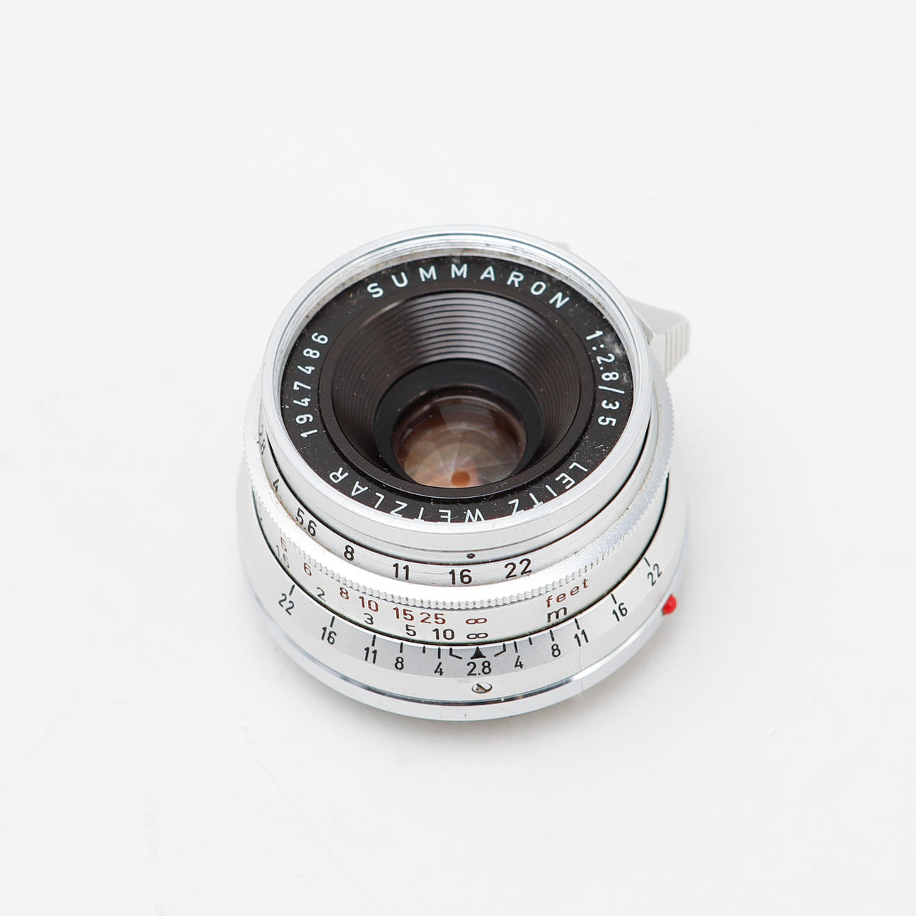 Nr. 910 748, Objektiv, Nr. 1947486 mit M-Fassung, Leitz Wetzlar Summaron, 35 mm f: 2,8. Mit Objektivschutz und Etui mit der Aufschrift Leica.