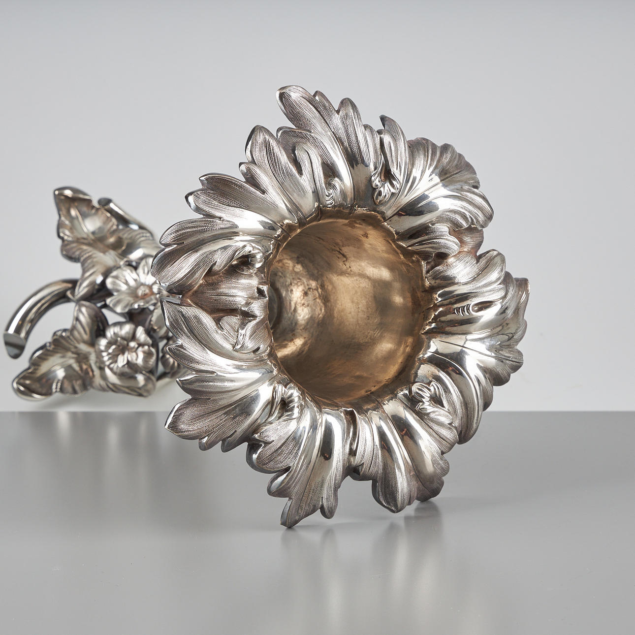 Reich verziert mit Blättern und Blumen. Durchmesser 23 cm, Höhe 35 cm, Gewicht ca. 770 g.