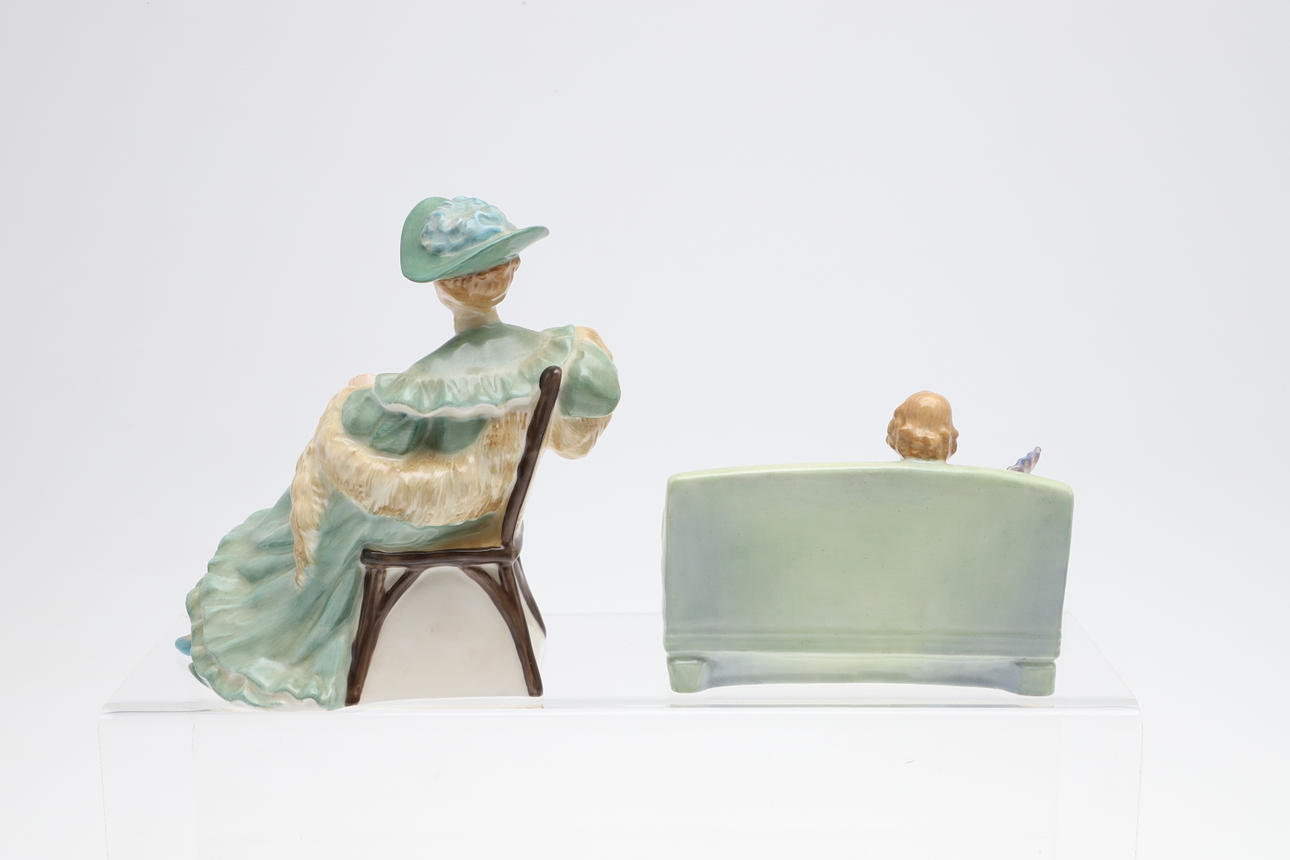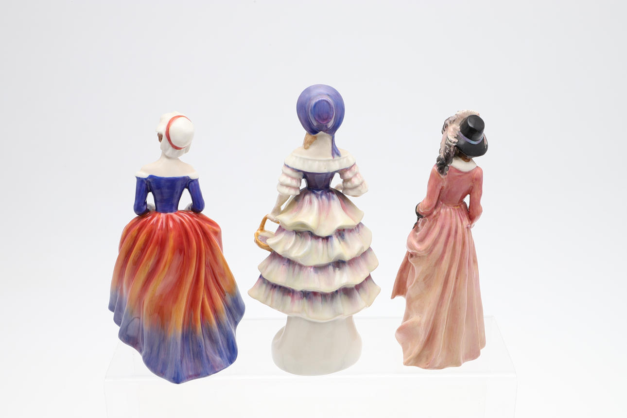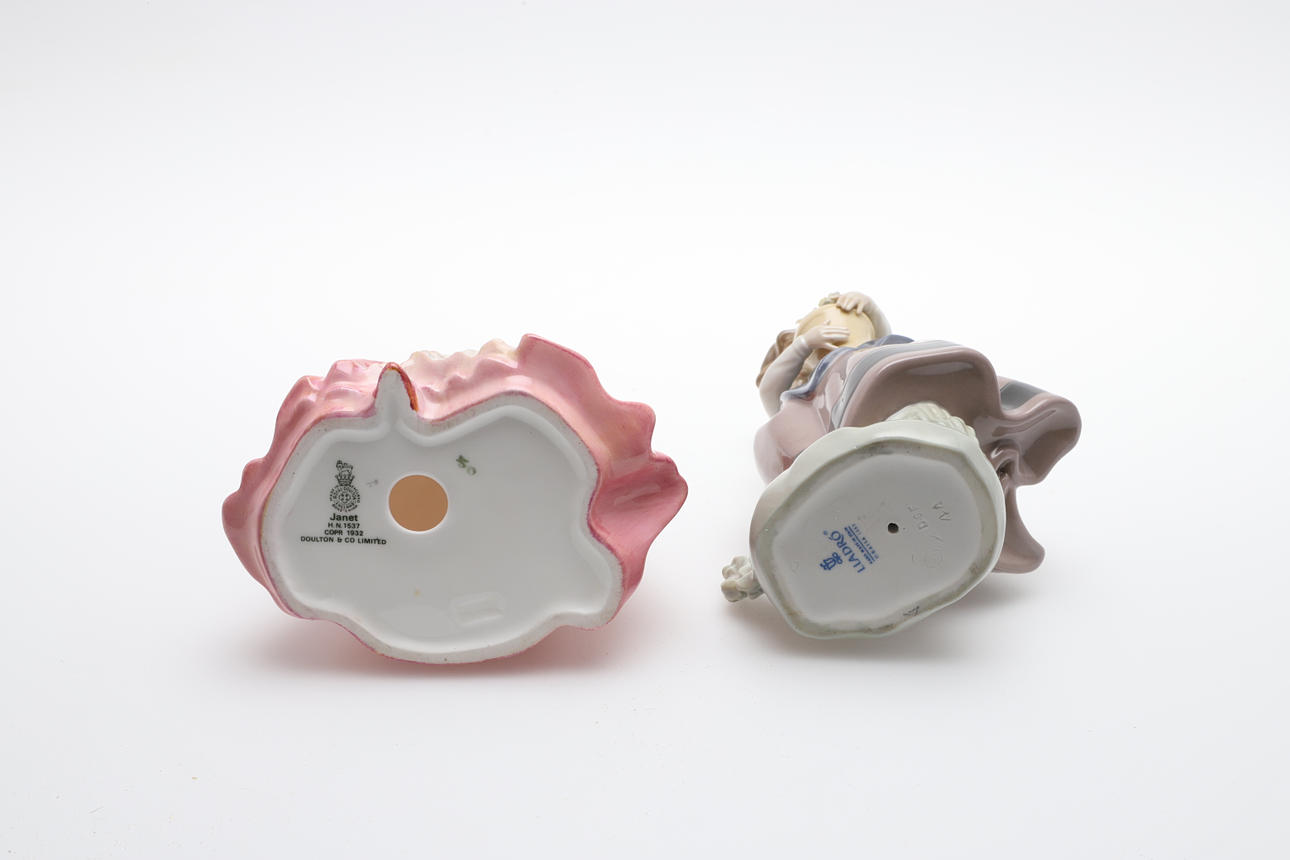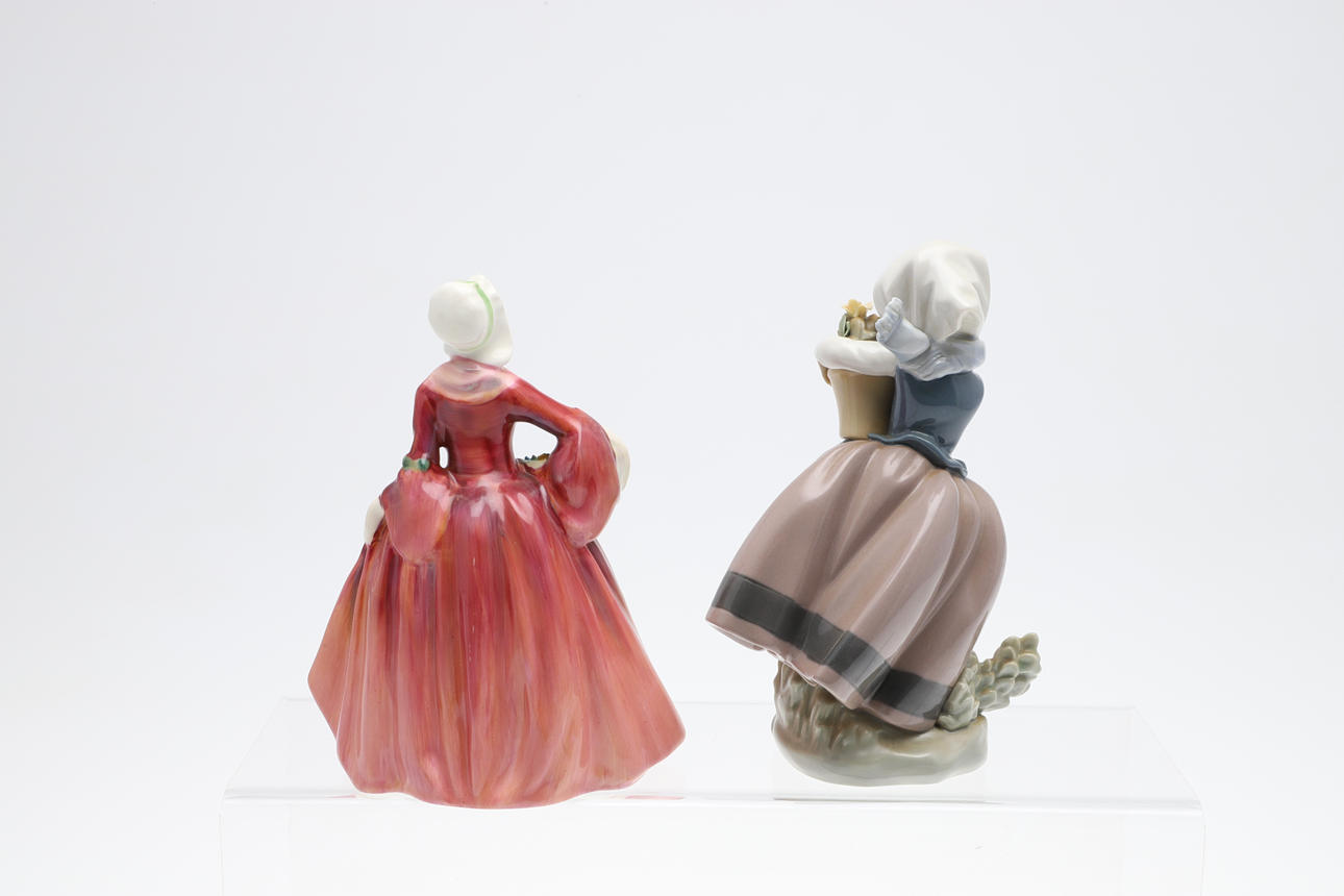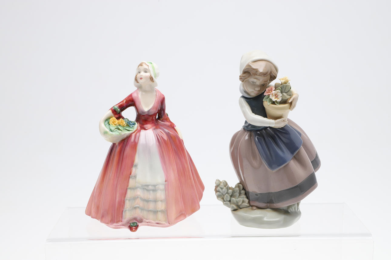 Phylis HN 3180, Meg HN 2743, Janet 1537, Maureen HN 1770, Ascot HN 2356, Sweet and Twenty HN 1589, die größte 21 cm, und eine Lladro-Figur eines Mädchens, das einen Blumentopf hält.