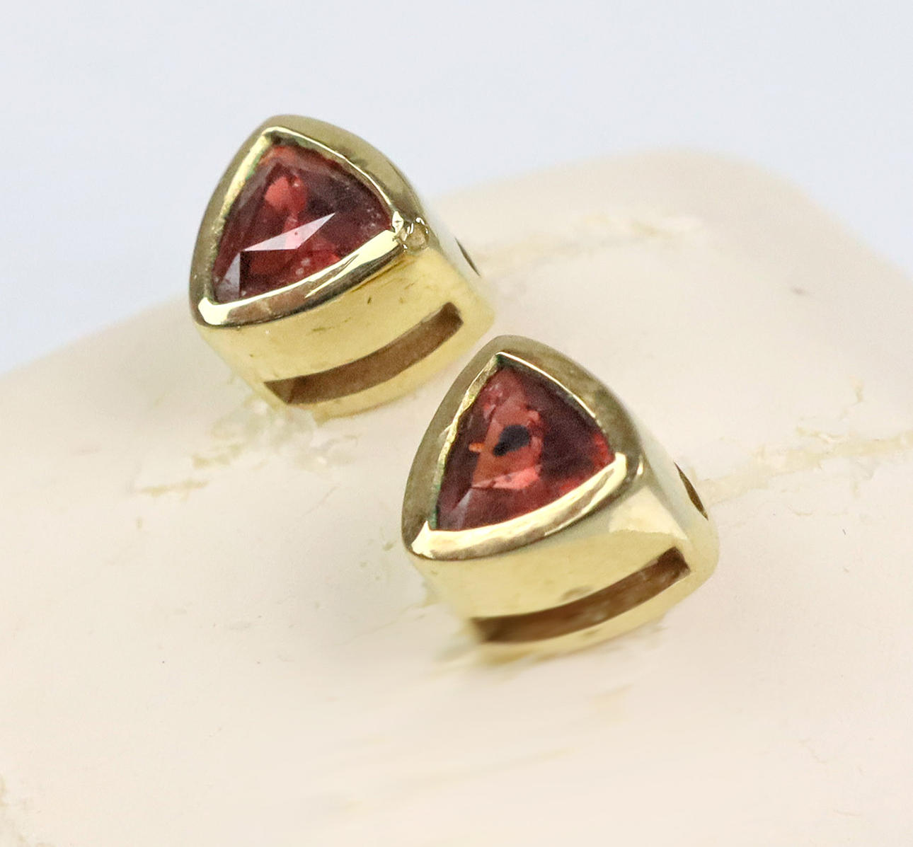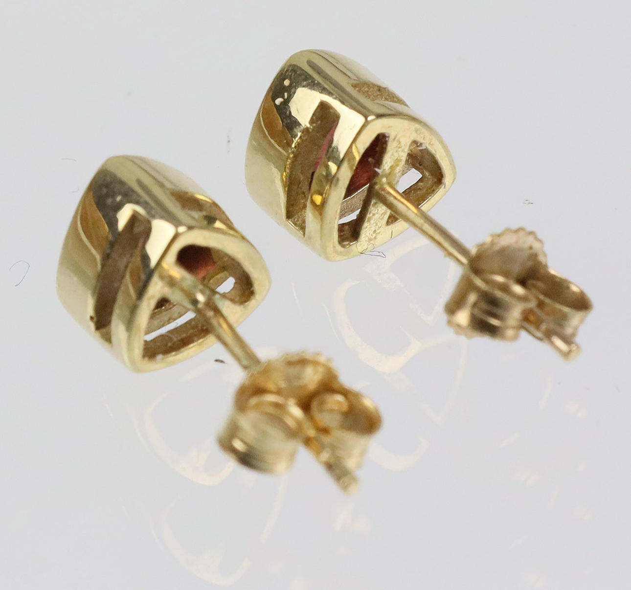 Ohrstecker punziert Gelbgold 375 (9 Karat), ca. 1,8 Gramm, ein Paar Ohrstecker mit Tansania Rubin im Trillantschliff von ca. 4,5 mm besetzt, mit Zertifikat.