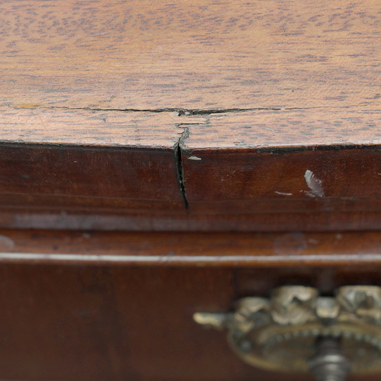 Markierungen, Risse und Kratzer, besonders auf der Oberseite. Kleinere Furnierschäden zwischen den Schubladen auf der Vorderseite.