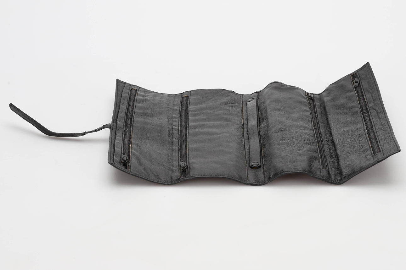 Maße aufgeklappt 34x26 cm. Vier Fächer mit Reißverschluss, ein Halter für Ringe. Gefaltet 8 x 26 cm. Wird mit Schnalle befestigt.