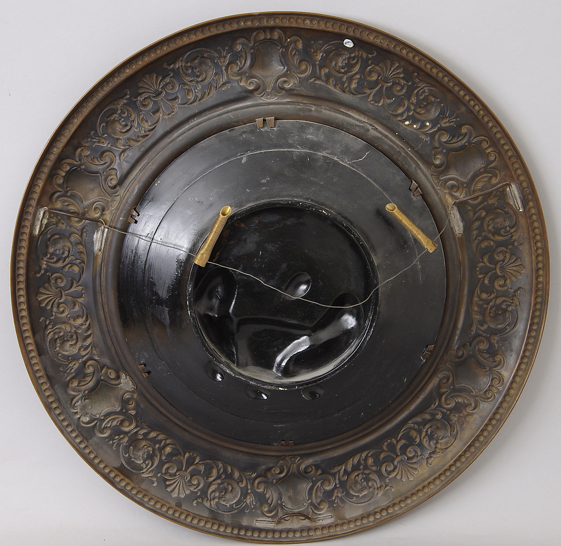 280356. RELIEFPLATTE IN MESSINGRAHMEN, Donuts trinkend.