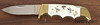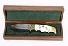 Gesamtlänge ca. 17 cm, Klingenlänge ca. 7,5 cm. Signierte Scrimshaw "856 G.HARBOUR 86". Inklusive originaler Holzschale.