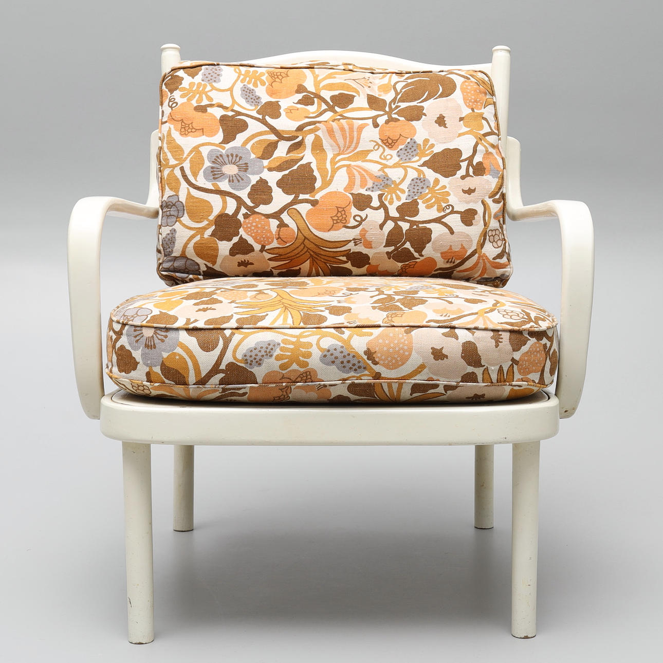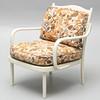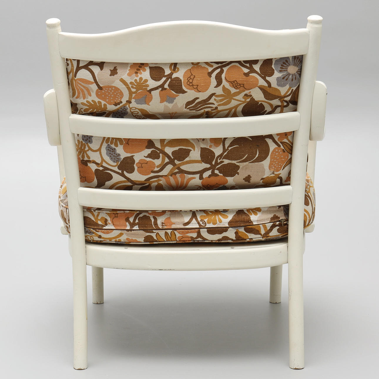 Sessel mit gepolsterter Sitzfläche aus Stoff mit Floramuster, weiß lackierter Rahmen.