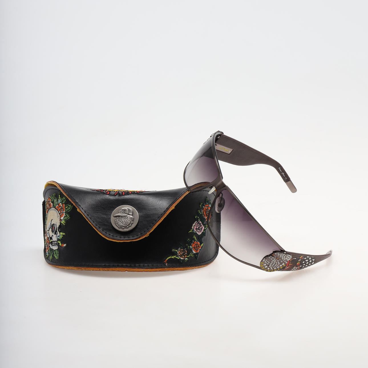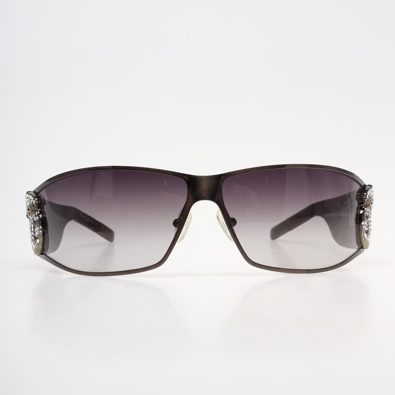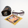 Modell 115 Gunmetal mit getönten Gläsern und Metallrahmen, Totenkopf mit Strasssteinen. Inklusive Reinigungstuch und Etui.