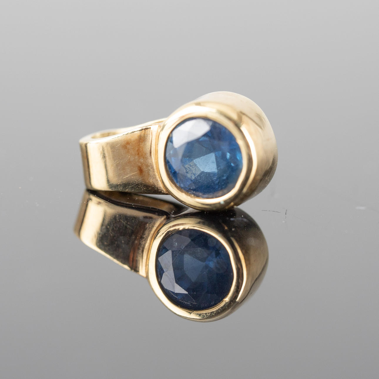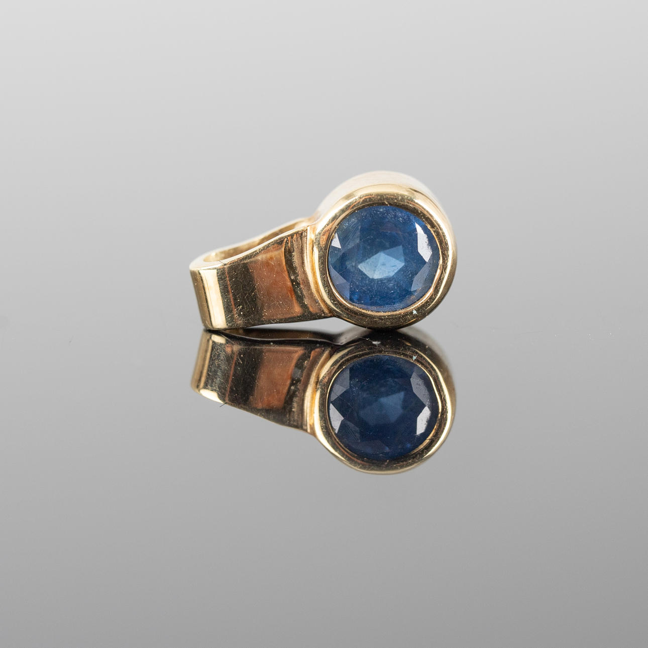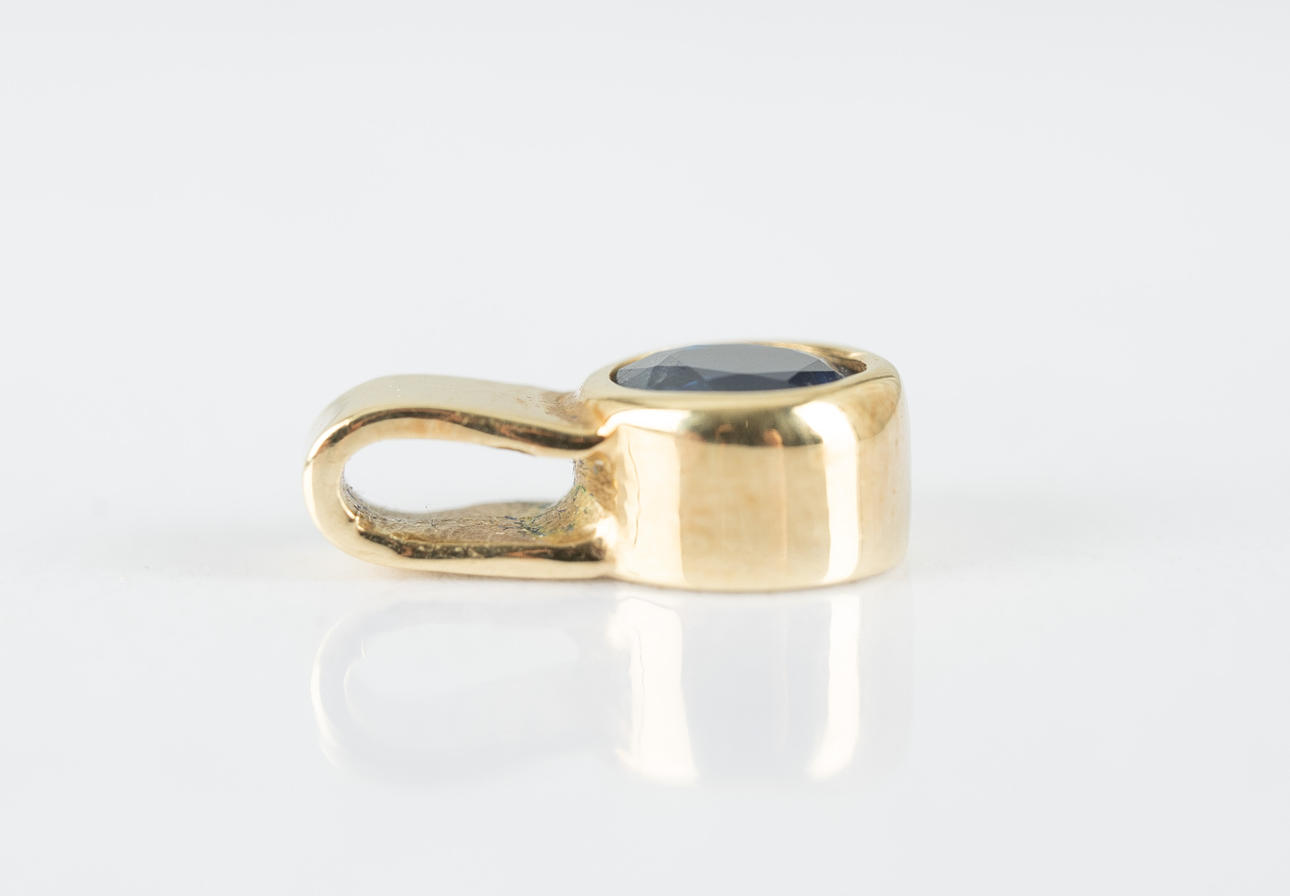 Anhänger gefertigt aus 585er Gold, besetzt mit einem Saphir von Ø ca. 5 mm. Gewicht ca. 1,9 Gramm.