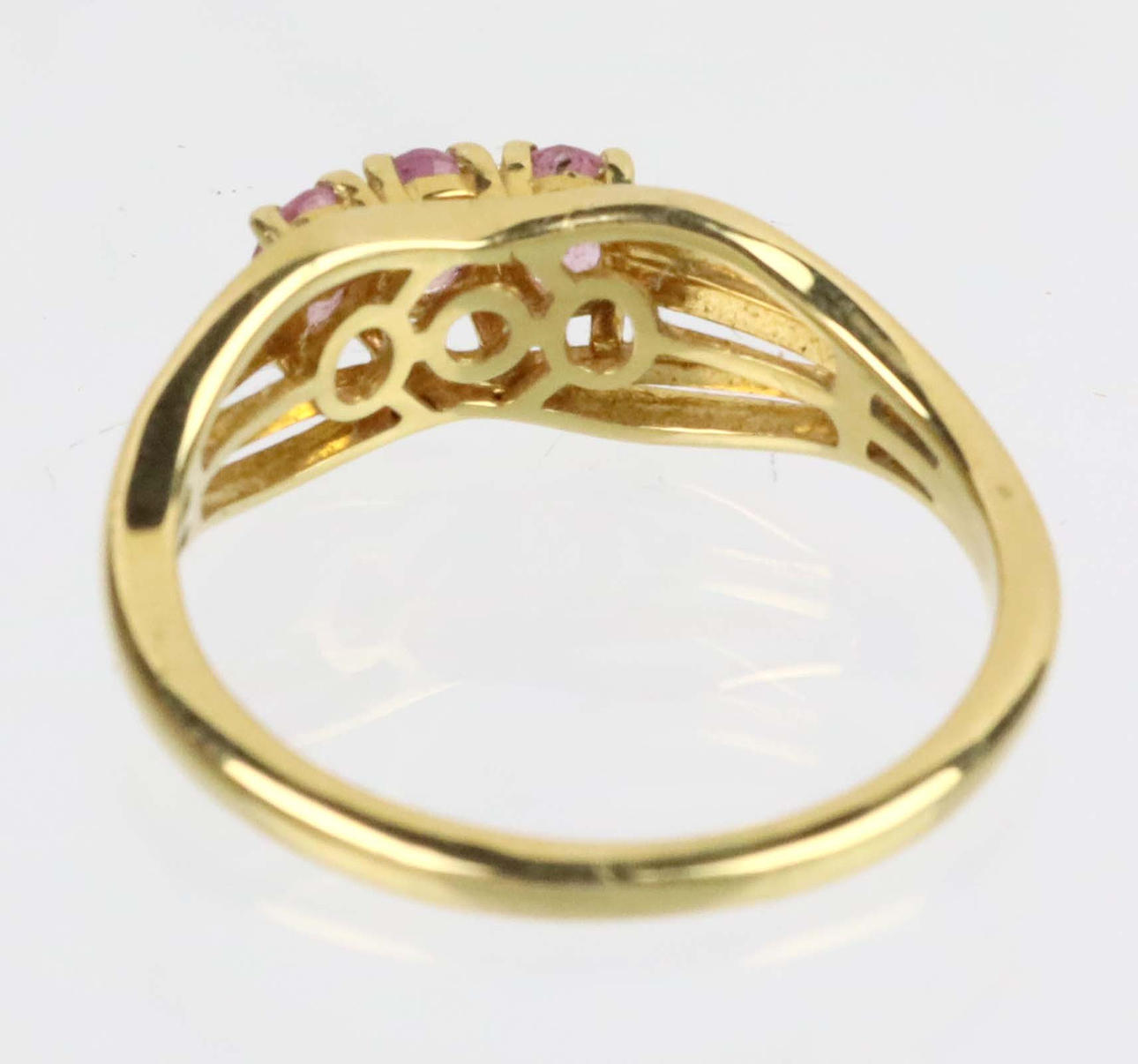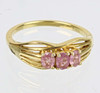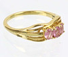 punziert Silber 925, ca. 2,5 Gramm, komplett in Gelbgold 585 vergoldet, der doppelt navettenförmige sowie gegliederte Ringkopf ist mit 3 pinkfarbenen Saphiren von ca. 4 x 3 mm im Ovalschliff besetzt, RG 57, InnenØ 18,1 mm.