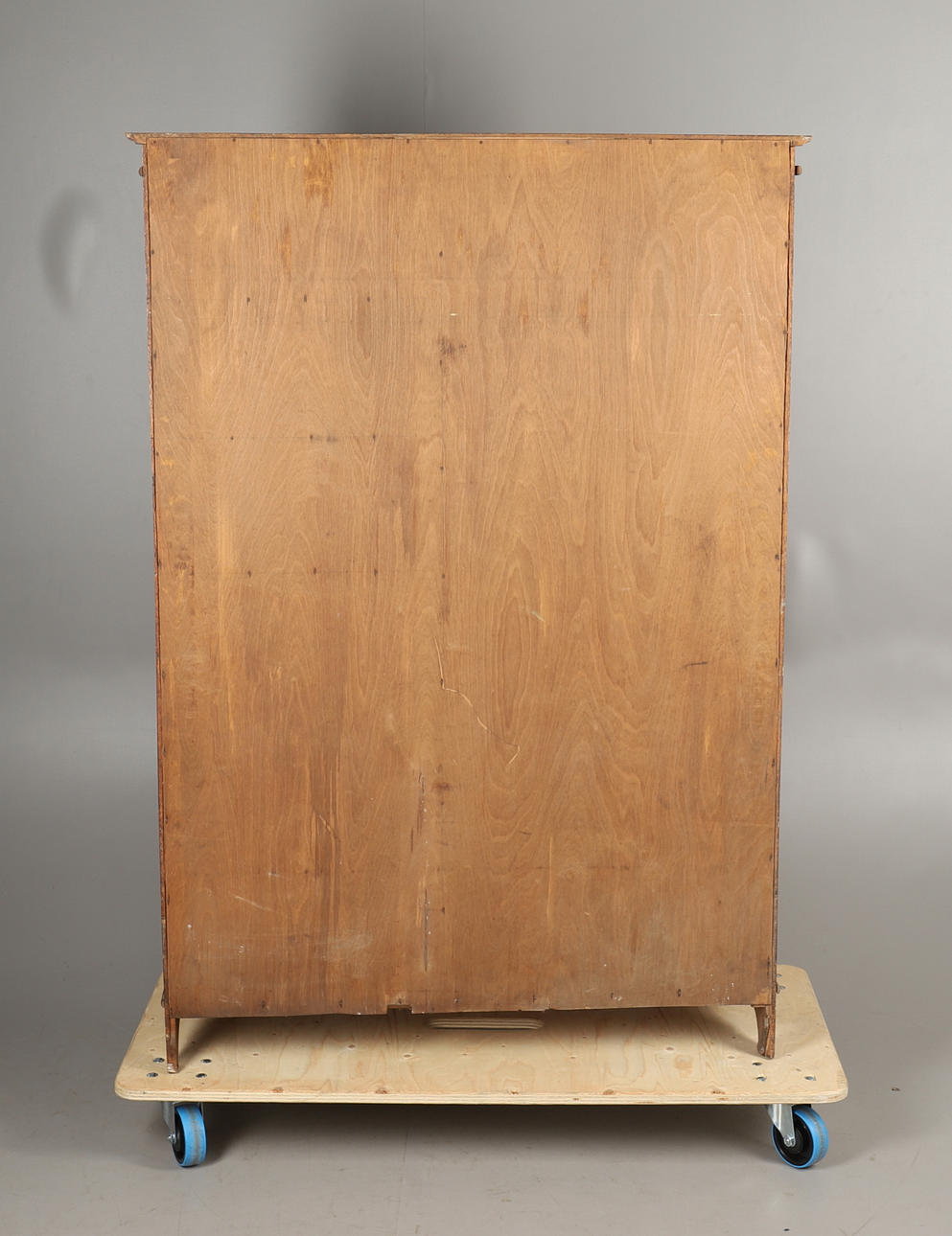 Die Doppeltüren öffnen sich, um einen unterteilten Innenraum zu enthüllen, eine Seite zum Aufhängen, die andere mit Schublade, Auszügen und Schuhregal, alles auf Konsolenfüßen, 107 cm x 43 cm x 153 cm hoch.