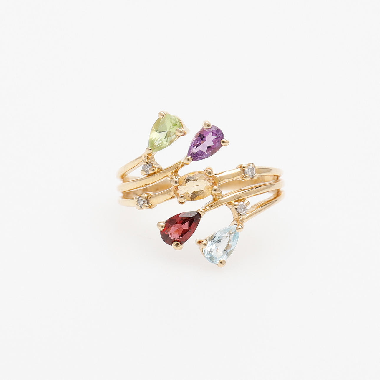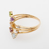 18 Karat Gold und fünf verschiedenfarbige Steine und vier kleine Diamanten, Größe 17, Gewicht 2,9 Gramm.