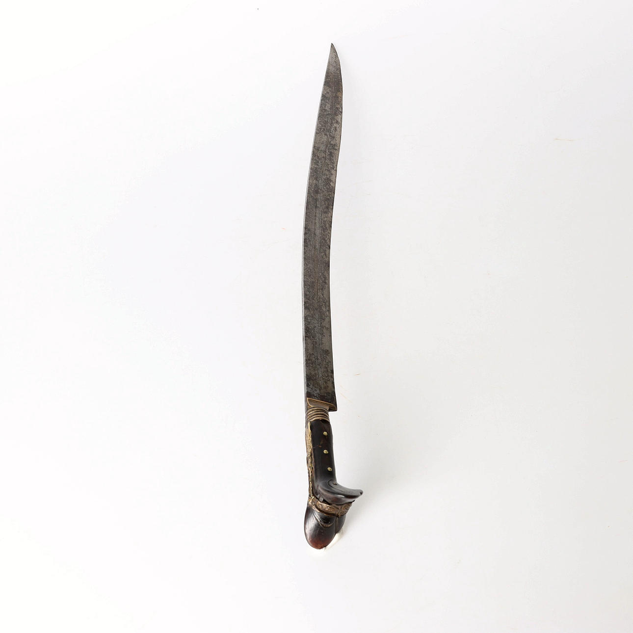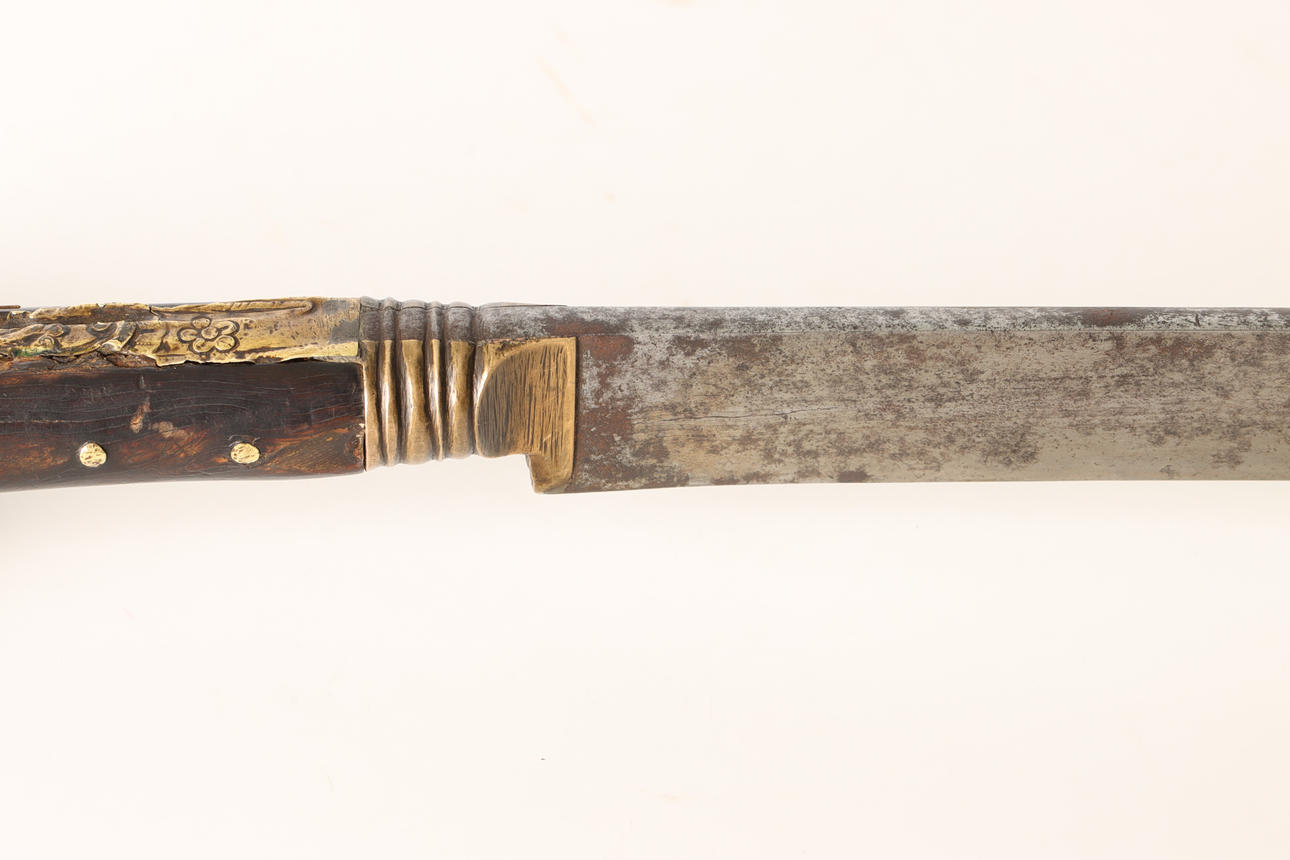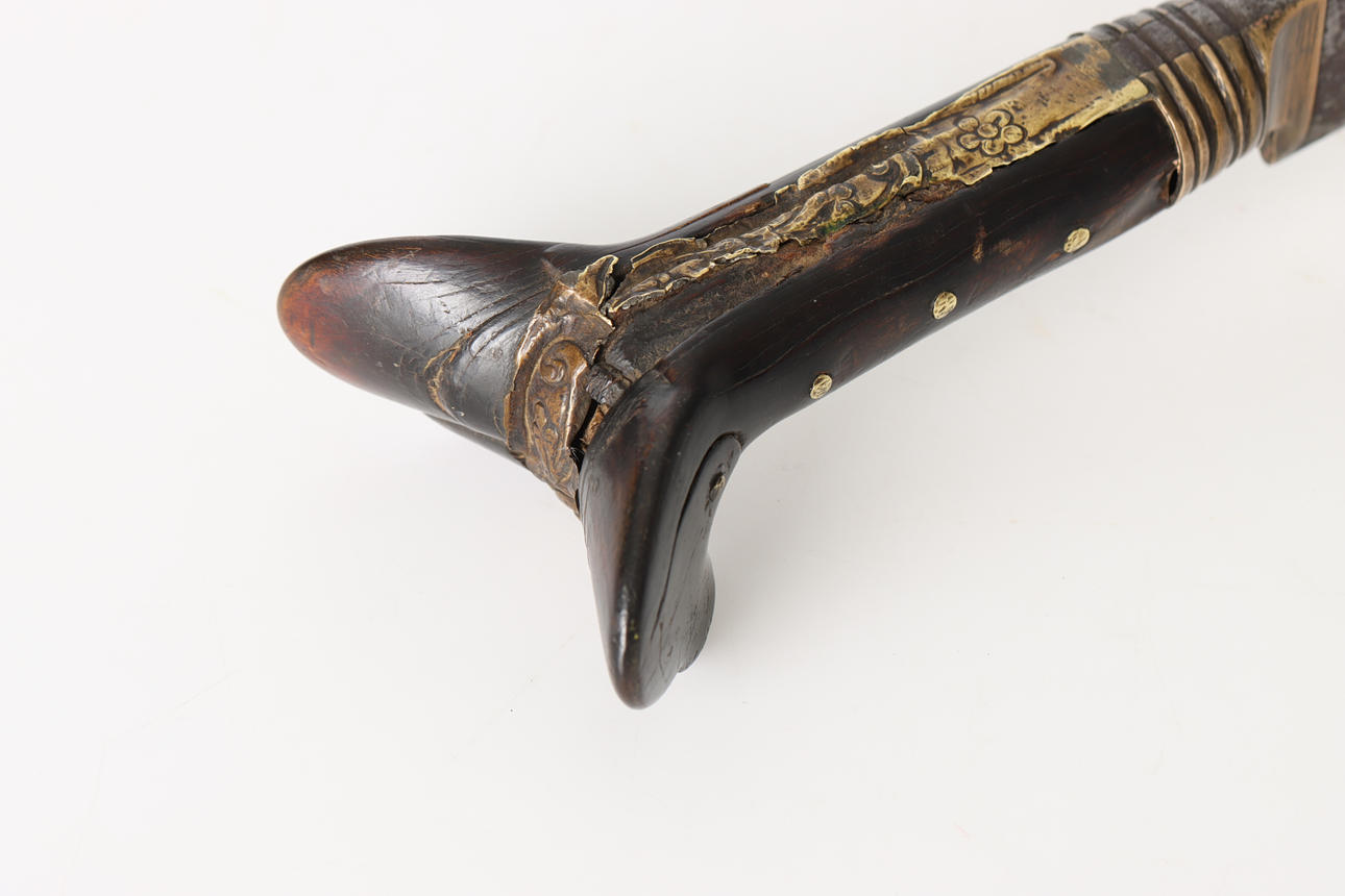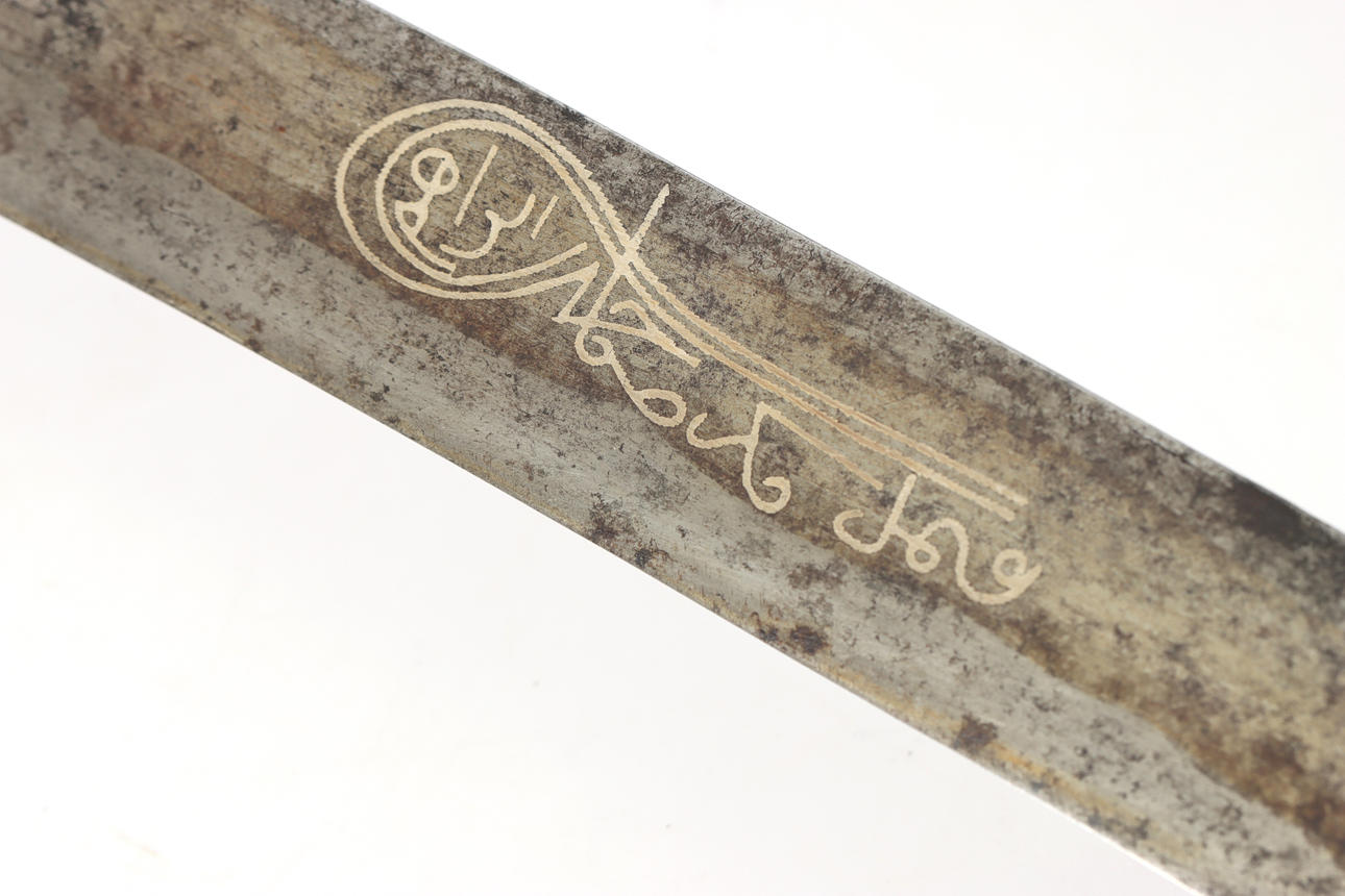 Yatagan, osmanisches Kurzschwert, Nudelholz aus Horn und Messingplatte mit Dekoration. Einschneidige gebogene Stahlklinge mit arabischer Inschrift "Made for Ibrahim".