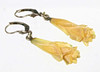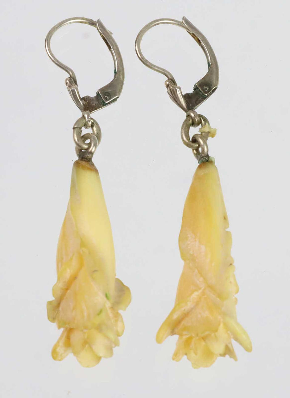ein Paar Ohrhänger mit Klappohrbügel in Silber 835. Daran je beweglich eine von Hand geschnittene Bein Blüte in länglicher Form von ca. 30 mm Länge und ca.12 mm Ø, Tragelänge ca. 52 mm. Gewicht ca.4,35 Gramm.