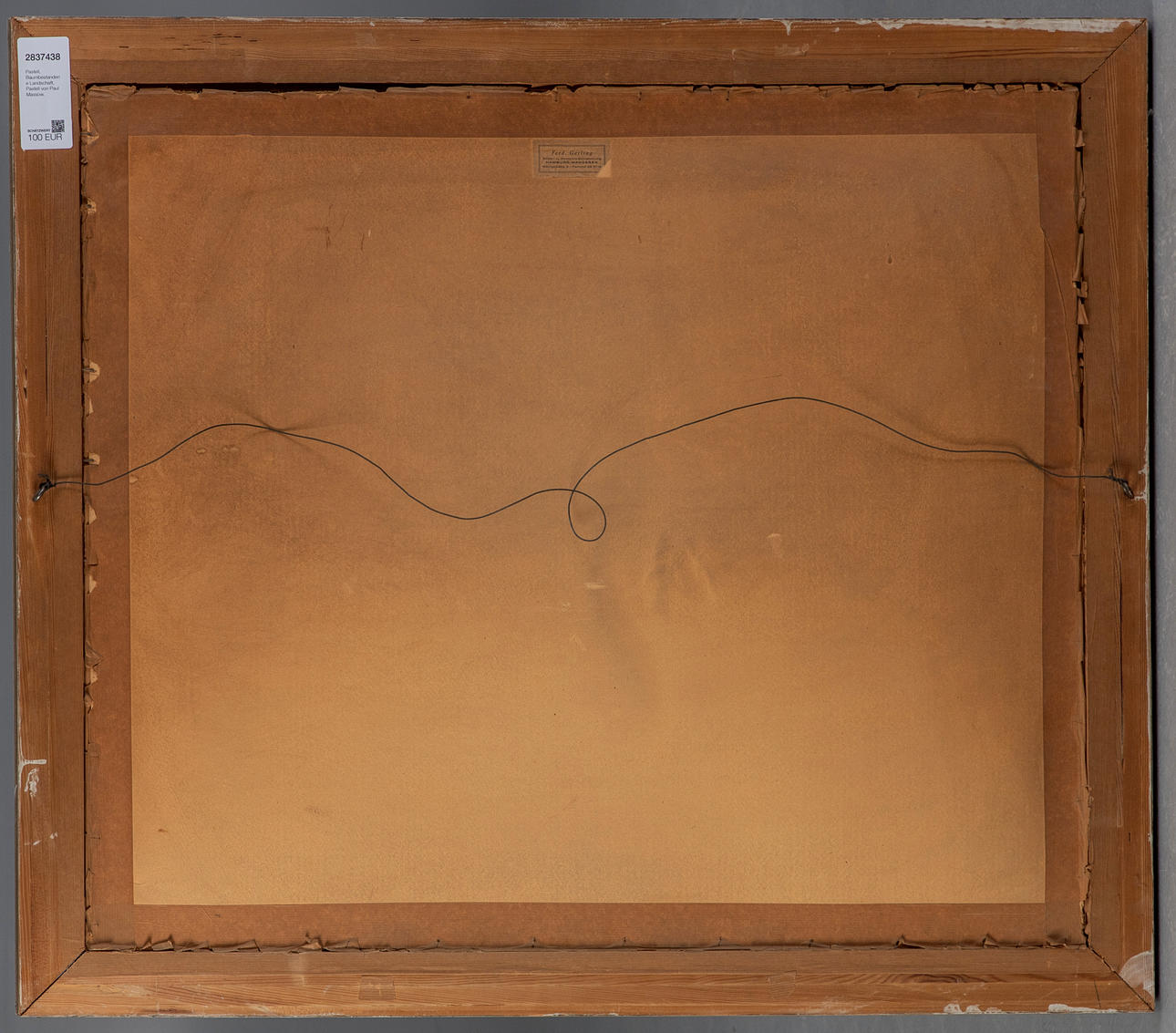 Nicht ausgerahmt begutachtet. Glas rechts unten gesprungen. Rahmen mit kleinen Defekten.
