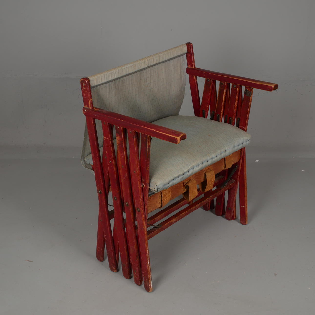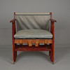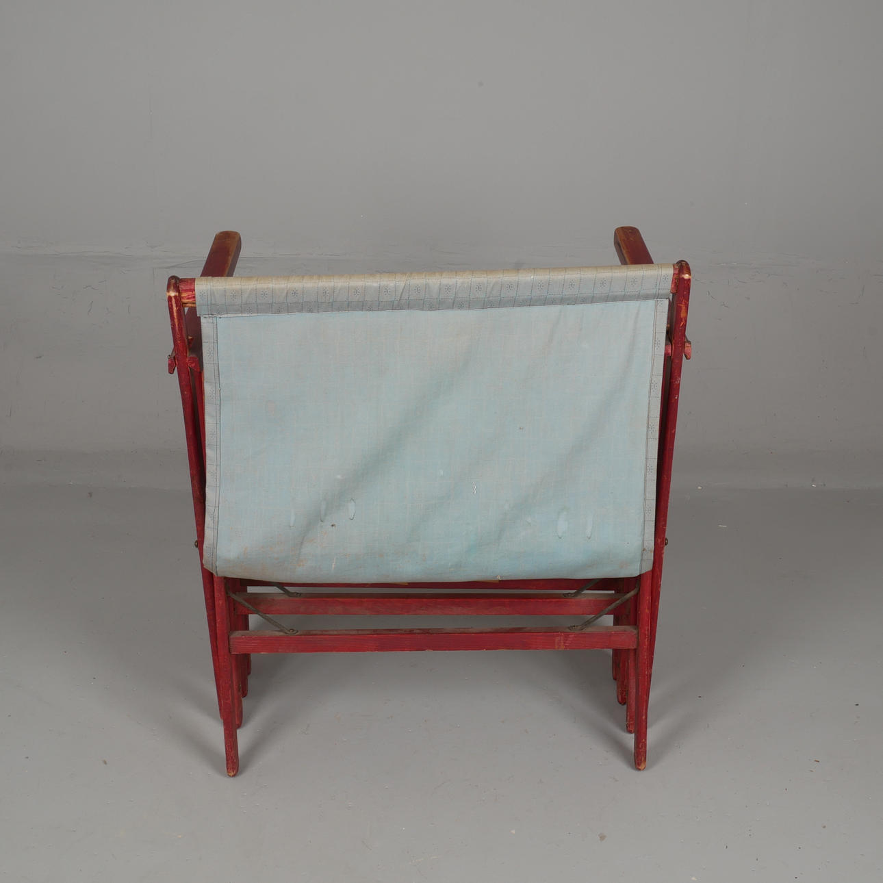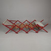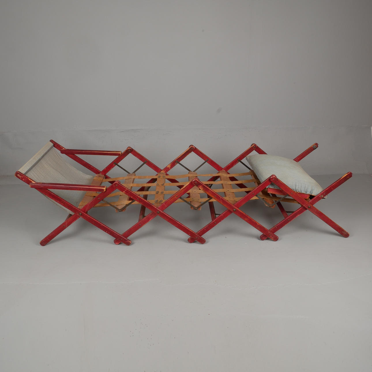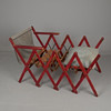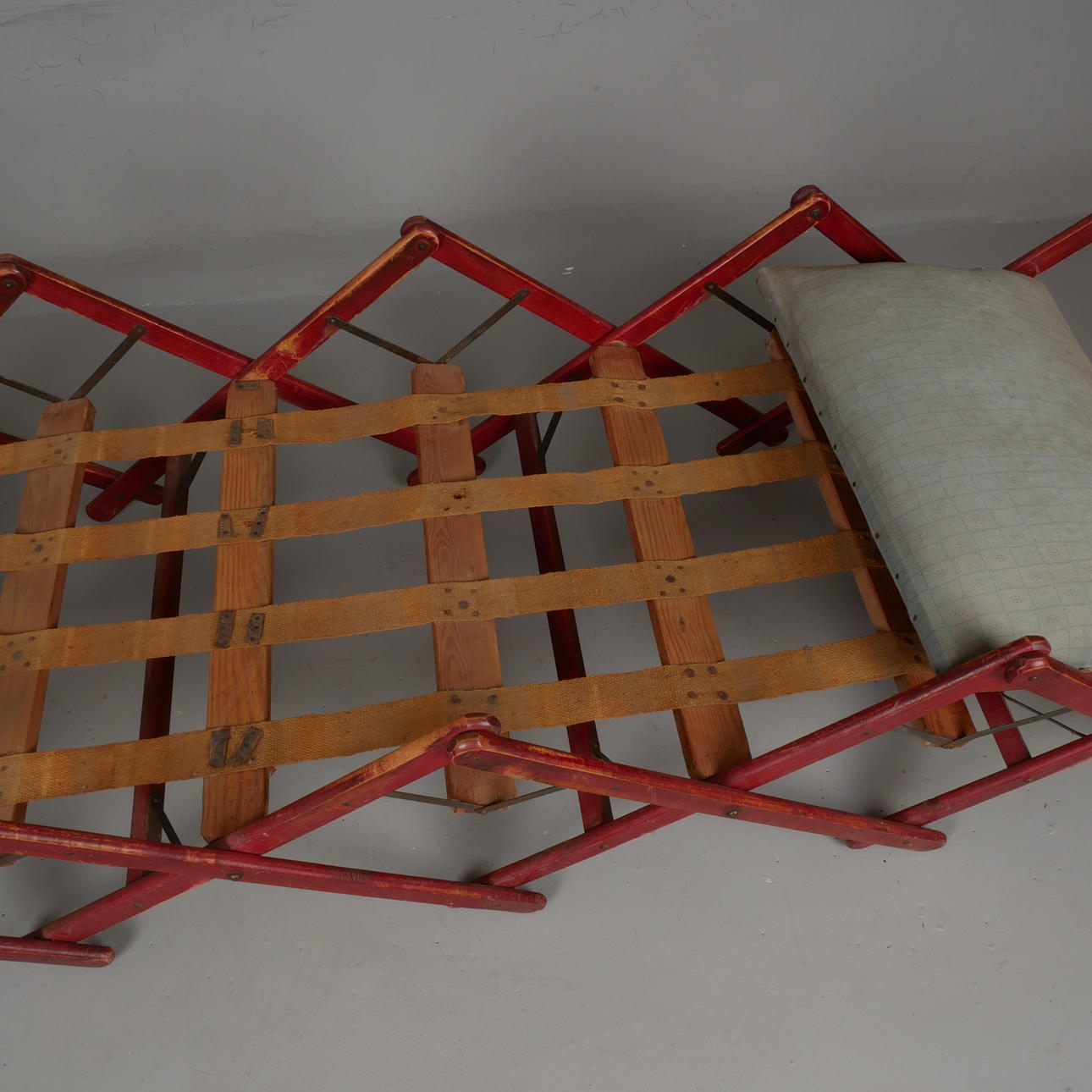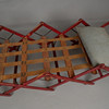 Sogenanntes „Schwiegermutterbett“. Bett als Stuhl kombiniert. Rot gebeizte Kiefer. Bettbreite ca. 58 cm. Länge entfaltet ca. 140-150 cm.