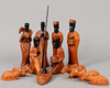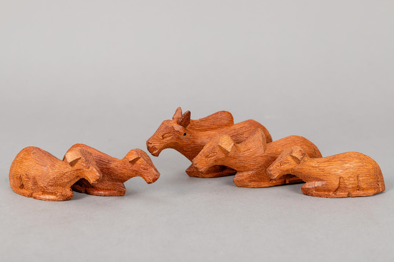 Holz, vollrund geschnitzt. Mehrteilige Figuren, u.a. bestehend aus Maria, Christkind, Joseph, die Heiligen Drei Könige, Hirte, 2 Dromedaren und Schafgruppen. H. 4-23 cm.