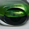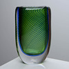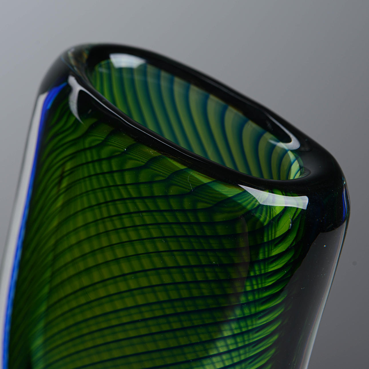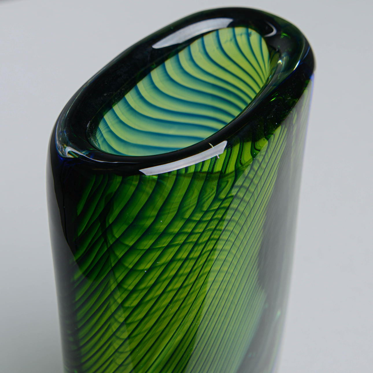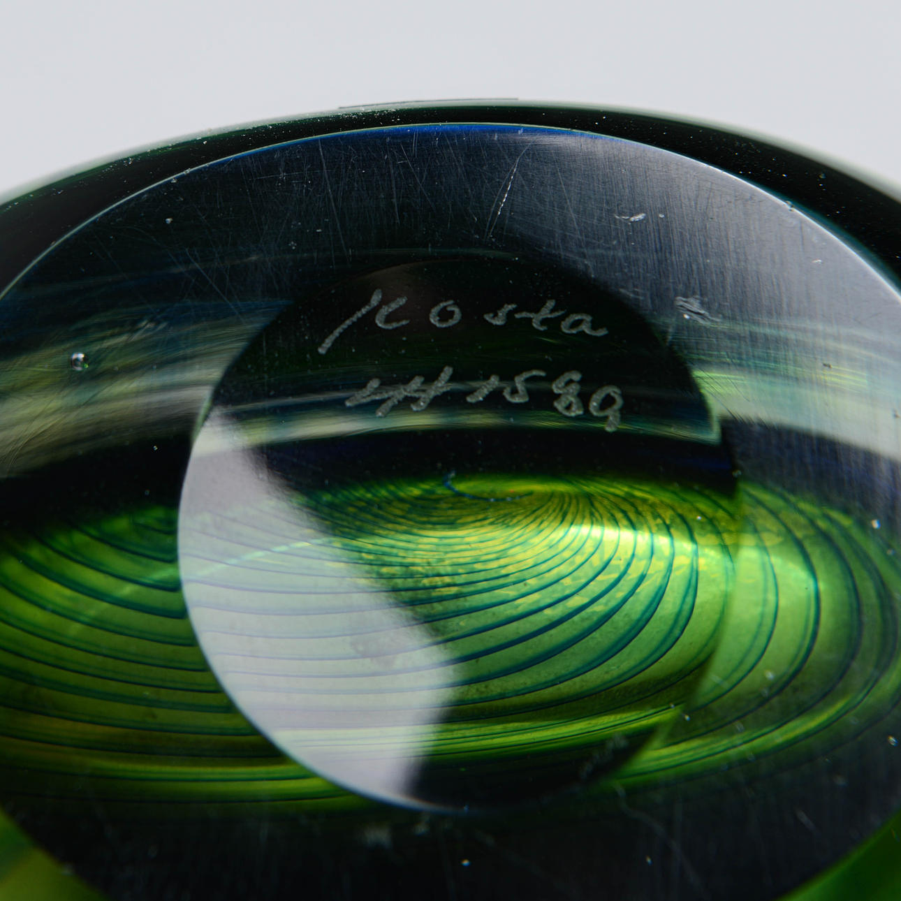 Grünes und blaues Unterfassungsglas in spiralförmig gedrehten Streifen aus klarem Glas. Signiert Kosta HH1589 und beschriftet.