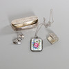 1 Anhänger mit Kette. handbemaltes Porzellan (ca. 3,5x4,5 cm), silber. Gestempelter Katzenfuß, NHW, B9 (1952). Kette, gestempelt mit Katzenfuß, Länge ca. 60 cm 1 Brosche, Silber, gestempelt mit Katzenfuß.