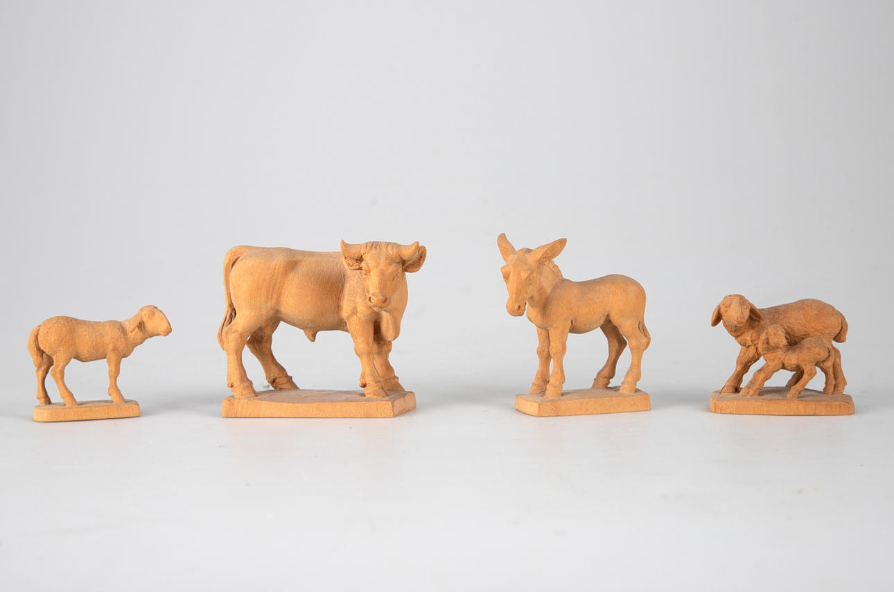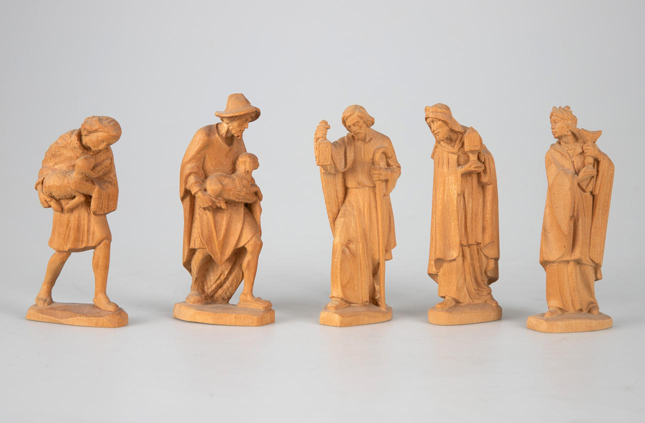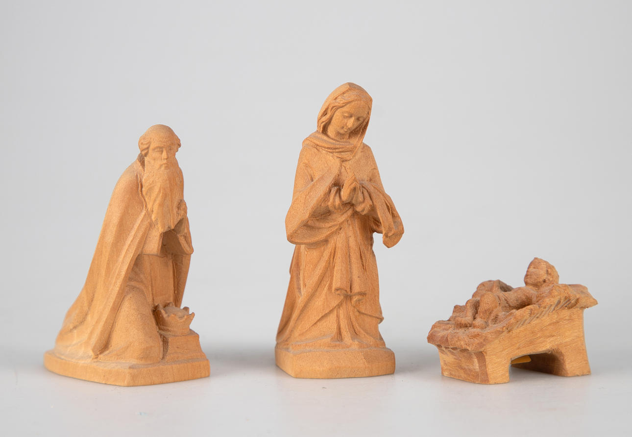 Lindenholz, vollrund geschnitzt. Mehrteilige Figuren, u.a. bestehend aus Maria, Christkind, Joseph, die Heiligen Drei Könige, 2 Schäfern, 2 Dromedaren, 1Esel, 1 Ochsen und 7 Schafen, bzw. Schafgruppen. Teilweise mit den originalen Preisschildern und einer Datierung ´16.09.76`.