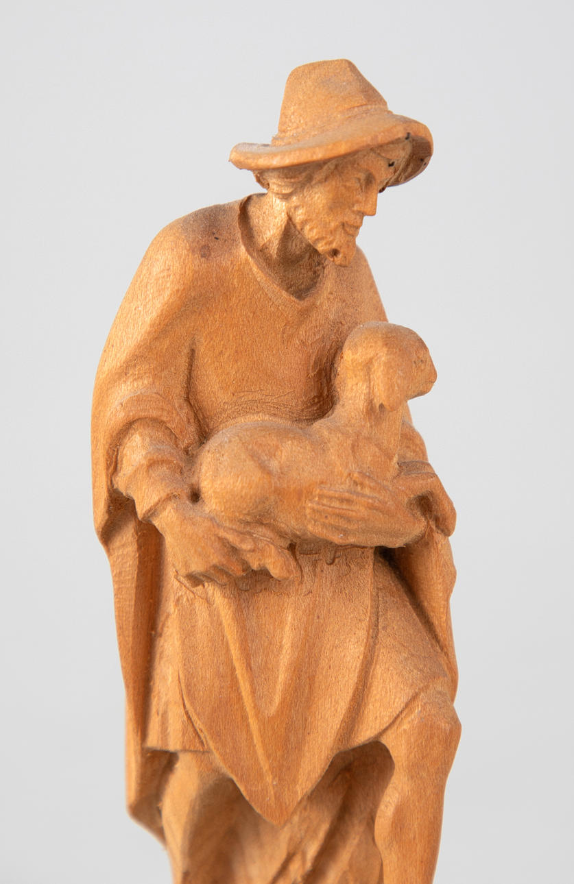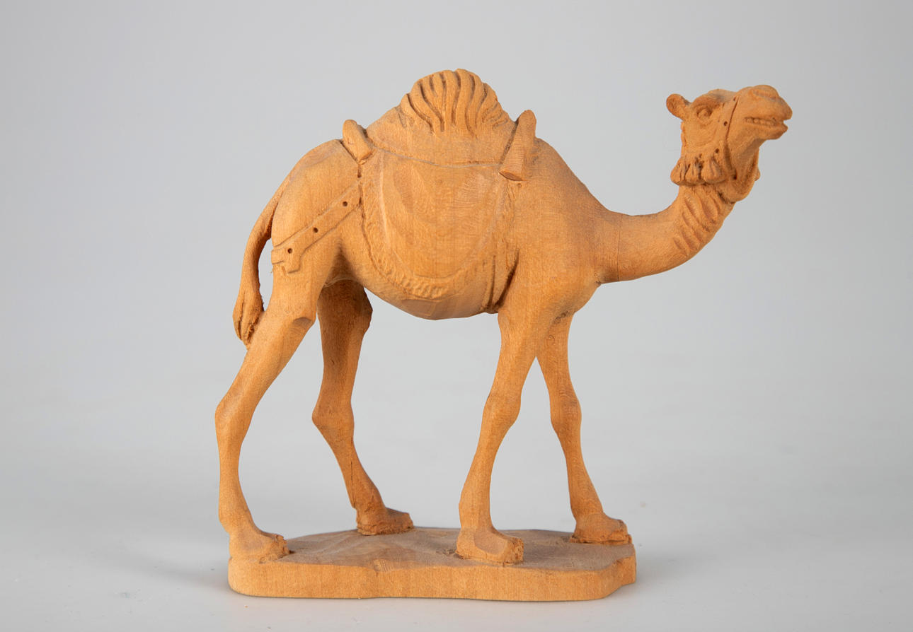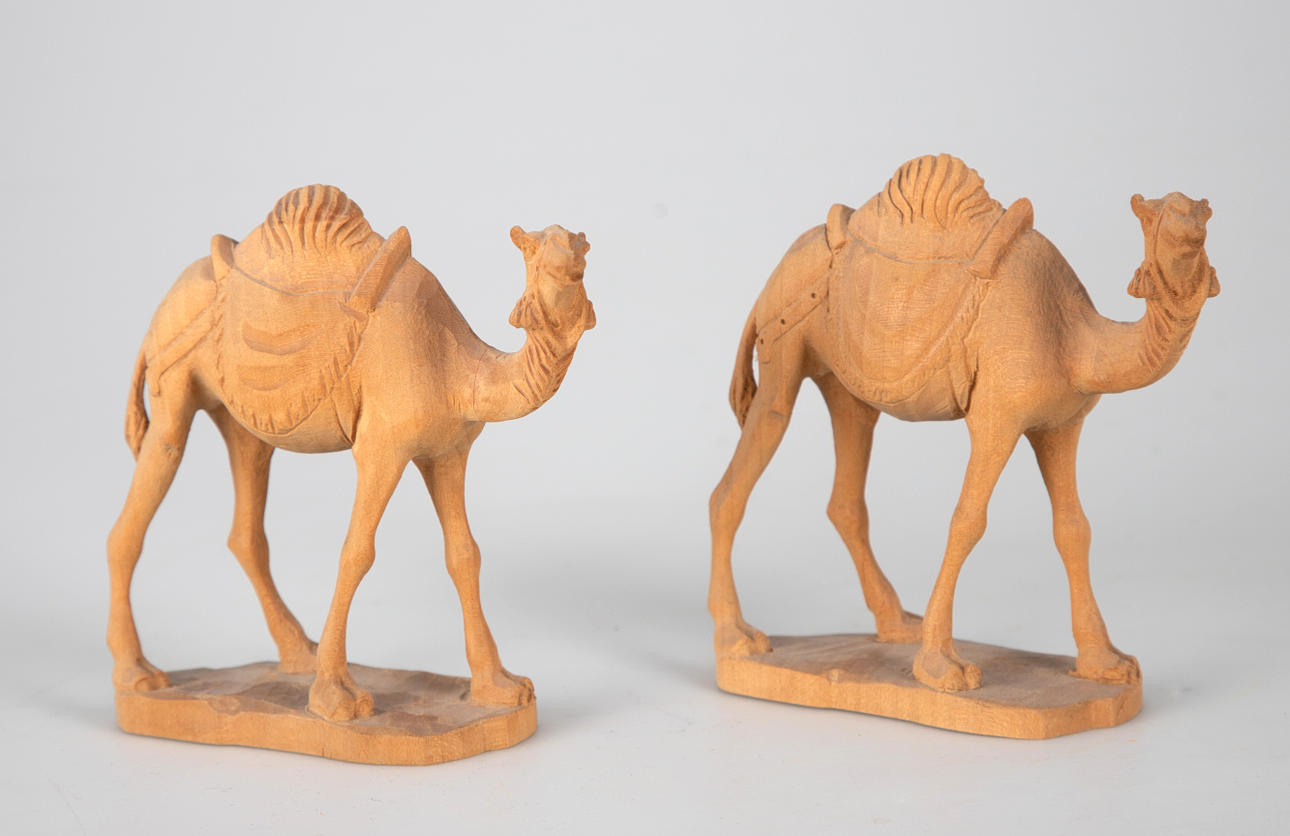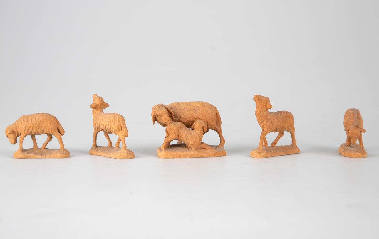 Lindenholz, vollrund geschnitzt. Mehrteilige Figuren, u.a. bestehend aus Maria, Christkind, Joseph, die Heiligen Drei Könige, 2 Schäfern, 2 Dromedaren, 1Esel, 1 Ochsen und 7 Schafen, bzw. Schafgruppen. Teilweise mit den originalen Preisschildern und einer Datierung ´16.09.76`.