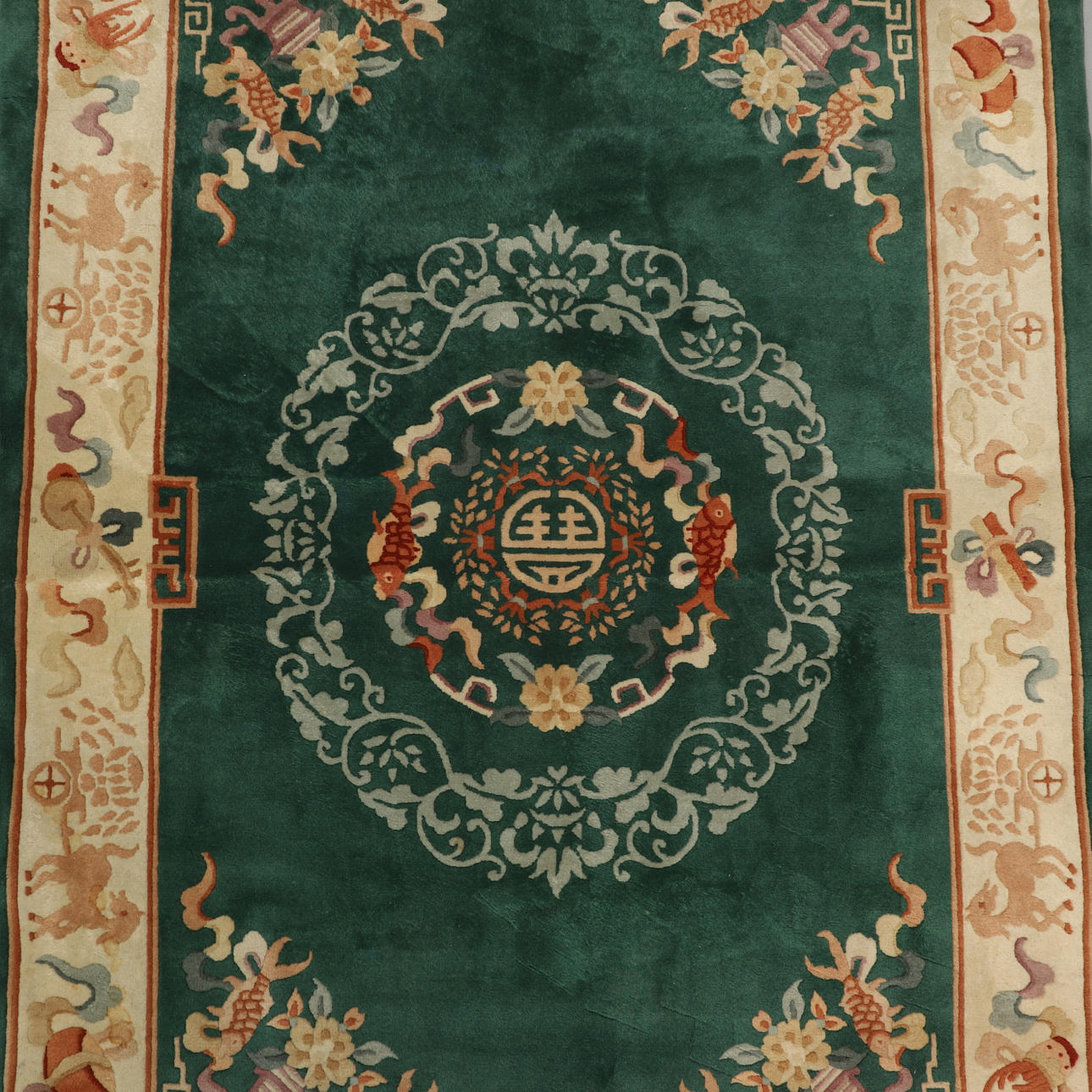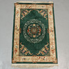 Smaragdgrüner und beiger Boden mit polychromen Mustern. Maße ca. 210 x 130 cm inklusive Fransen.