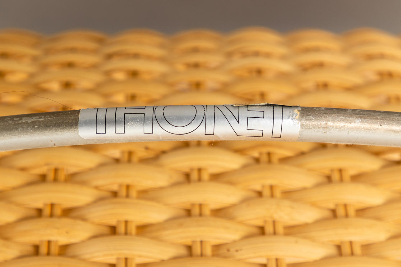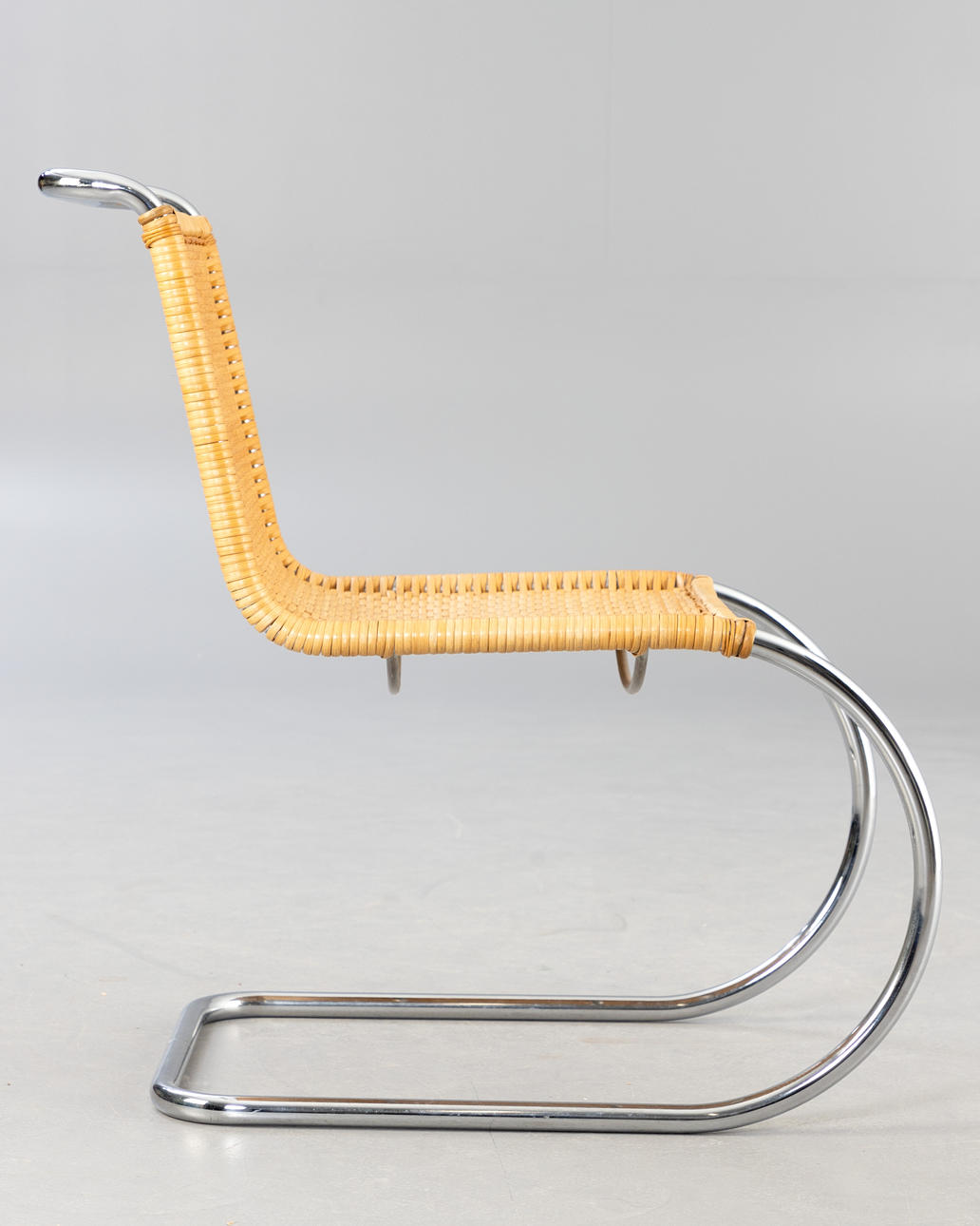 Freischwinger 'S533' von Ludwig Mies van der Rohe. Entwurf: 1927. Verchromtes Stahlrohrgestell mit einer Bespannung aus Korbgeflecht.