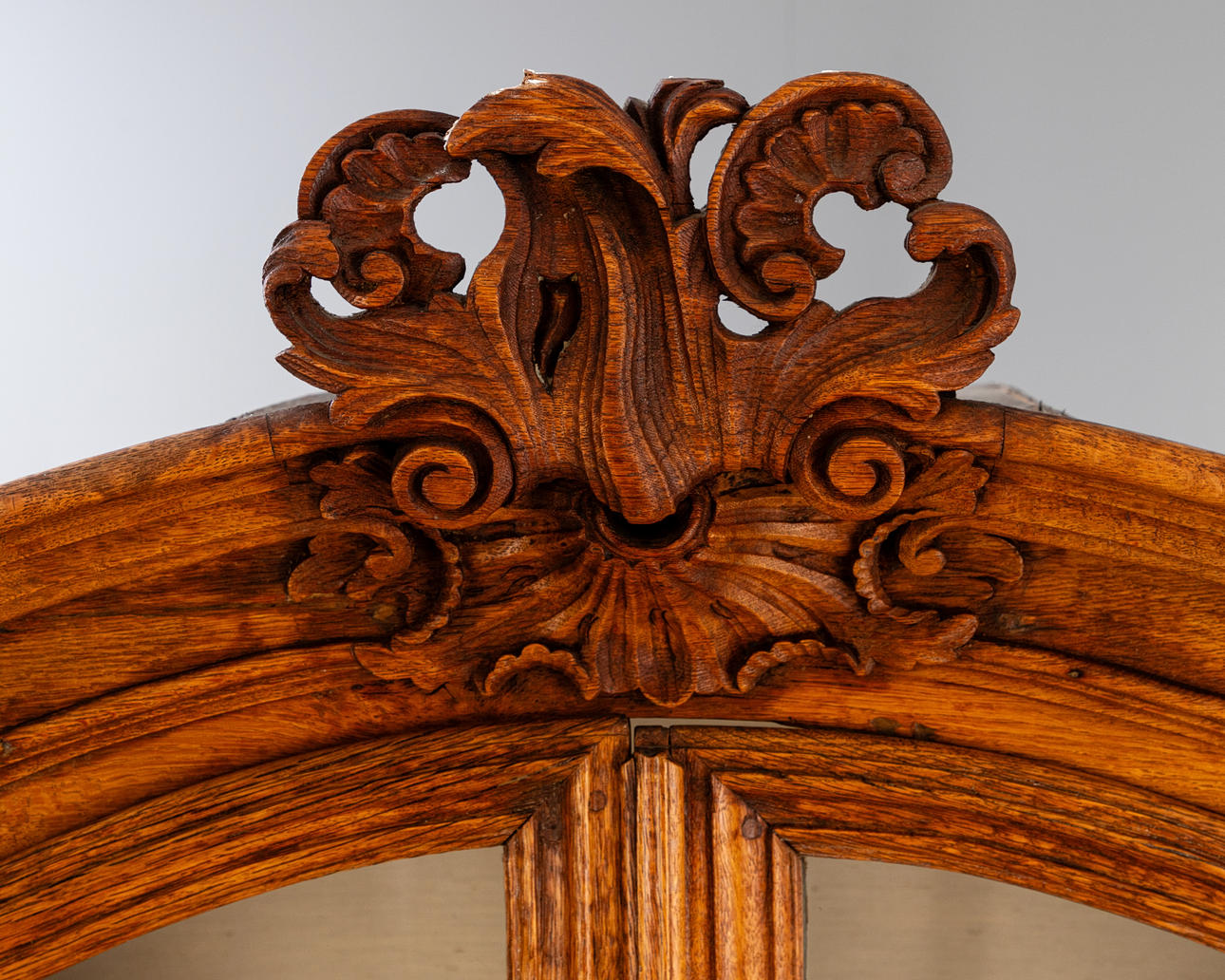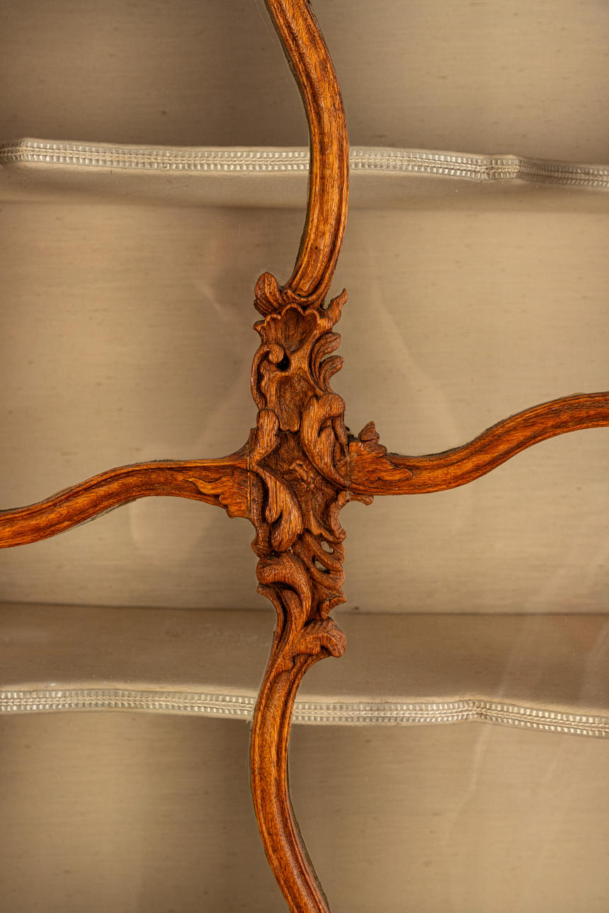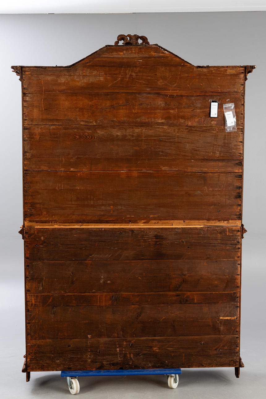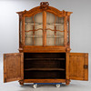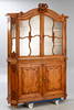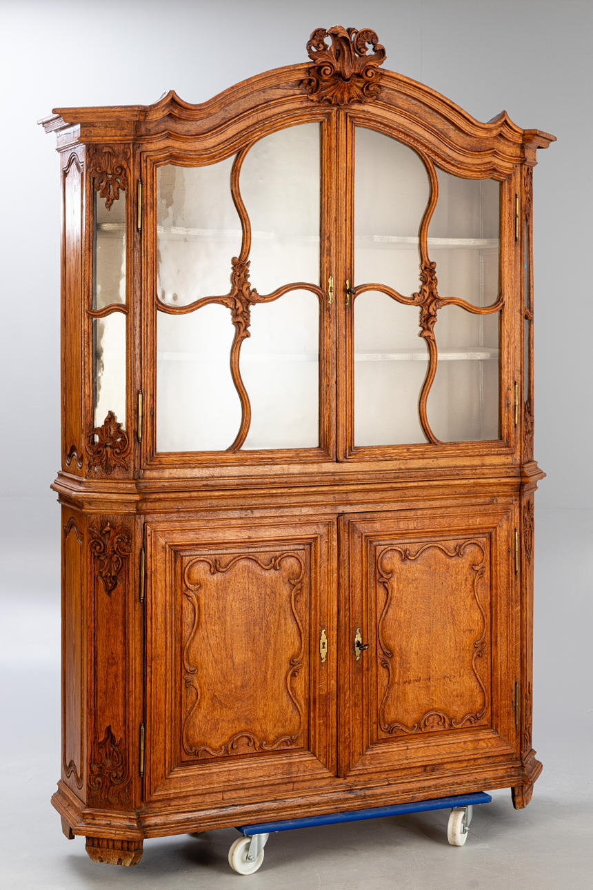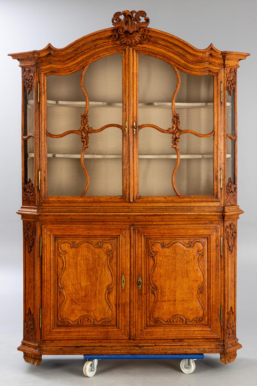 Eiche. Zweiteiliger Korpus auf über Eck gestellten Füßen und entsprechden Lisenen. Der zweitürige Unterschrank mit zwei Türen. Leisten gerahmte, geschweifte Zierelemente in den verrtieften, profilgerahmten Füllungen der Türfronten. Dreiseitig verglaster Aufsatz mit geschwungenen, kreuzartigen Streben. Segmentgiebel. Allumfassend profilierte Rahmungen und Leisten. Passige Ornamente in Form von Muscheln, C-Schwüngen und Rocaillen. Innen je zwei Regalböden. HxBxT: ca. 230 x 152 x 50 cm.