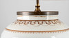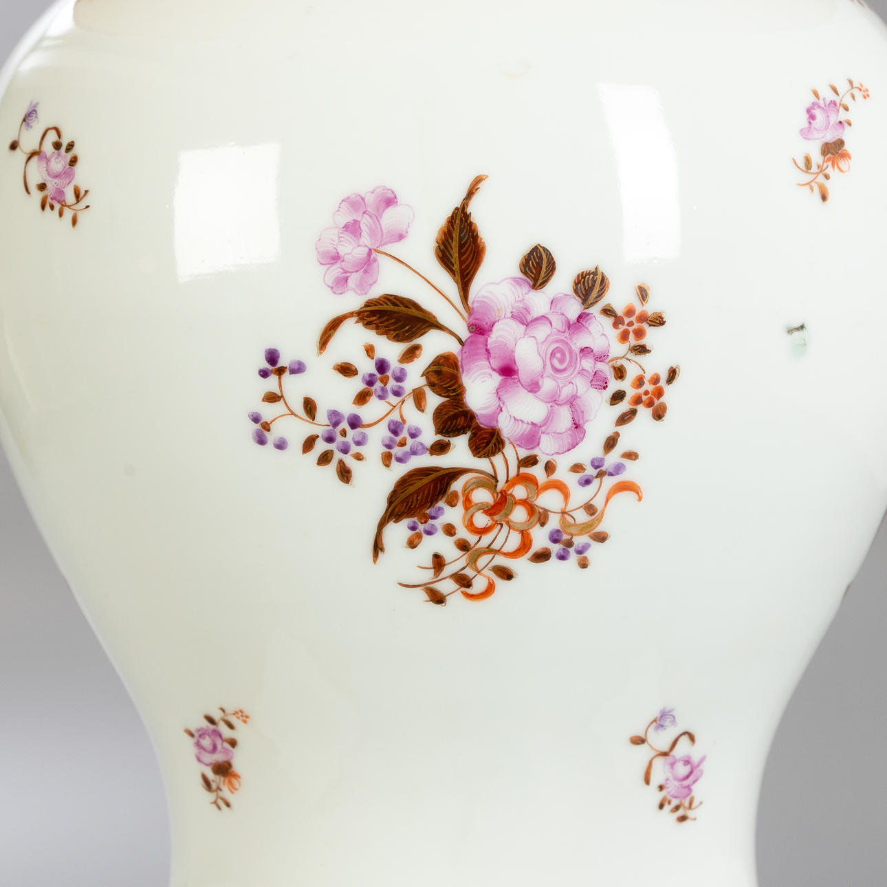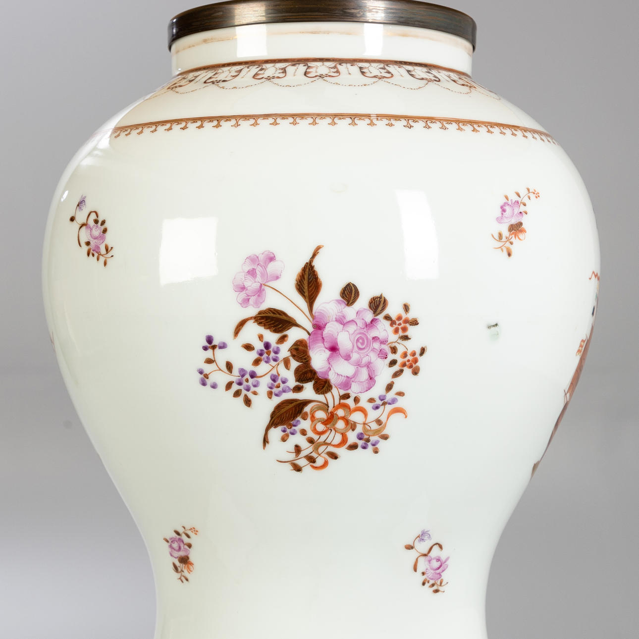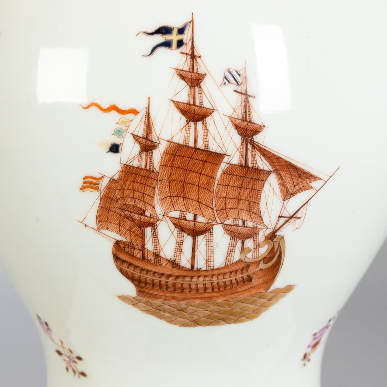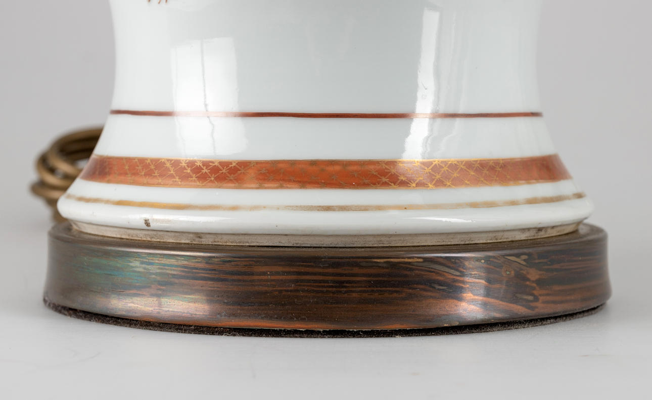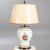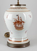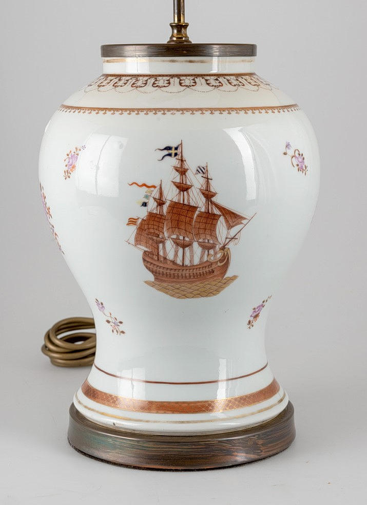 Lampenfuß in Balusterform. Steinzeug, partiell emailliert mit magentafarbener und brauner Aufglasur-Camaieumalerei. Zwei Schauseiten mit schwedischer Galeone, seitlich mit Blumen. Konischer Lampenschirm. 2-flammig, später elektrifiziert. HxDm.: ca. 30x21 cm (Vase), H. ca. 71 cm (Gesamt).